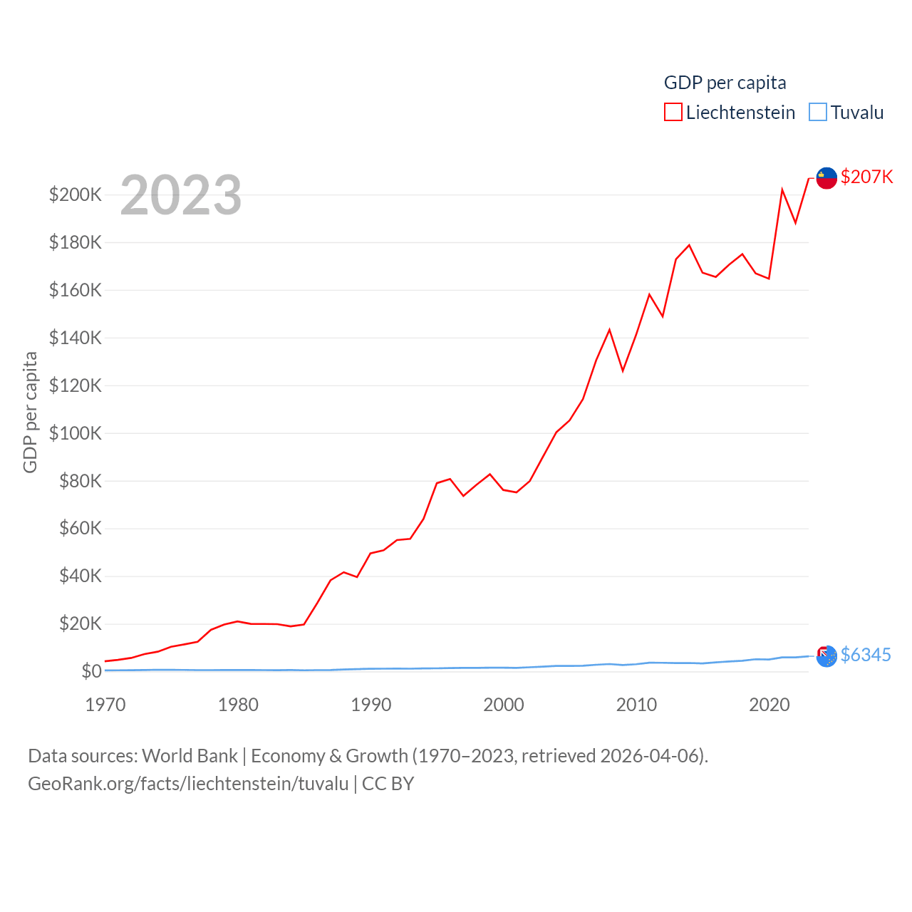 By GDP, Liechtenstein ranks 156/197 ($8.24B) and Tuvalu ranks 196/197 ($62.3M). By GDP per capita, Liechtenstein ranks 2/197 ($206,781), while Tuvalu ranks 110/197 ($6,345).