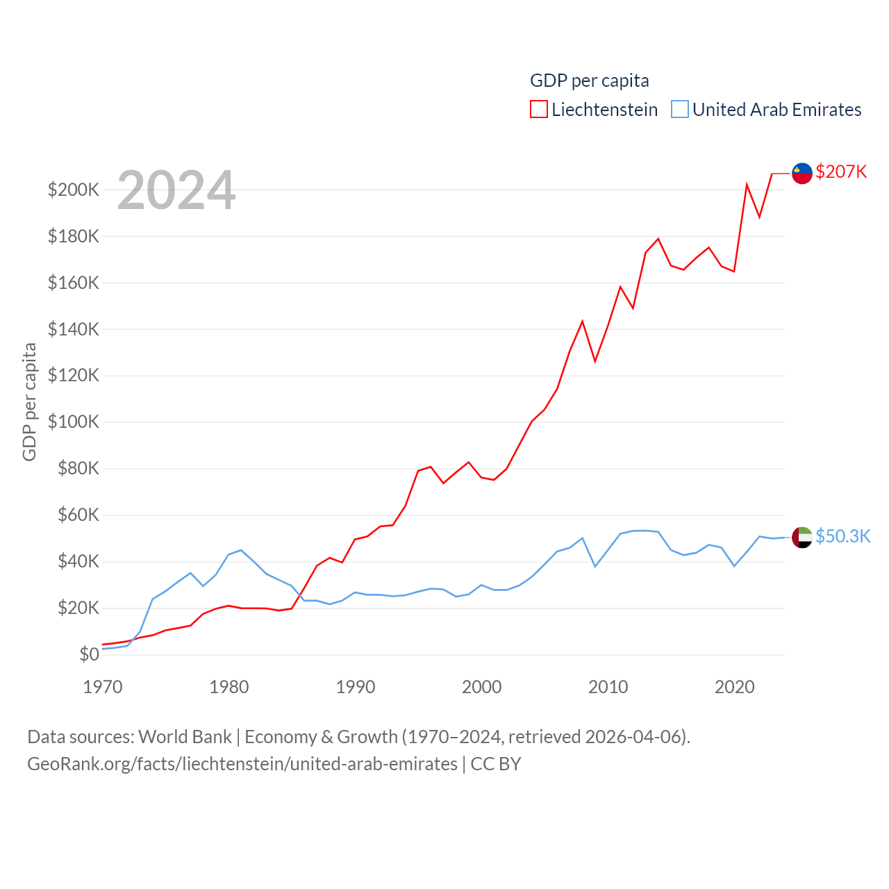 By GDP, Liechtenstein ranks 156/197 ($8.24B) and The United Arab Emirates ranks 27/197 ($552B). By GDP per capita, Liechtenstein ranks 2/197 ($206,781), while The United Arab Emirates ranks 24/197 ($50,274).