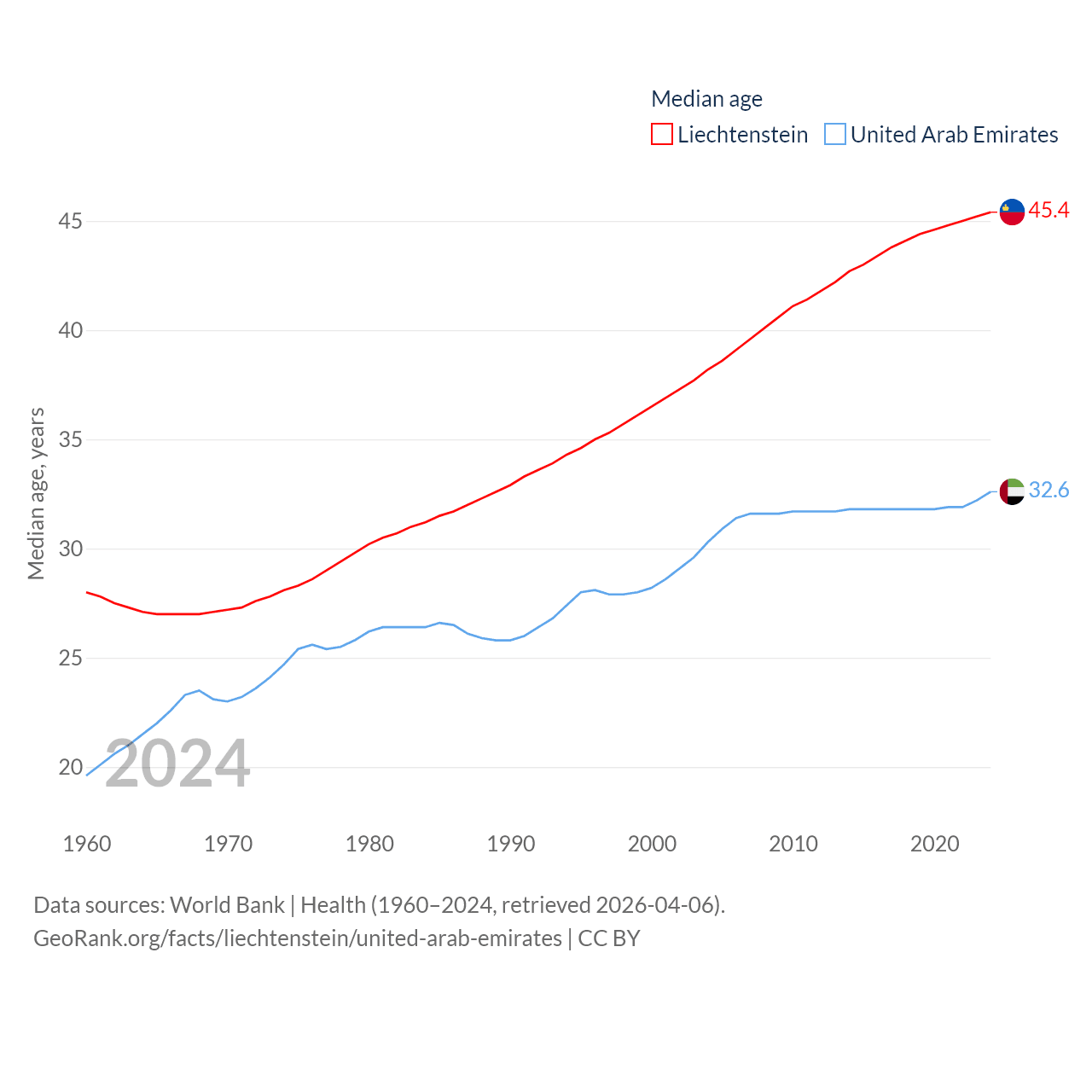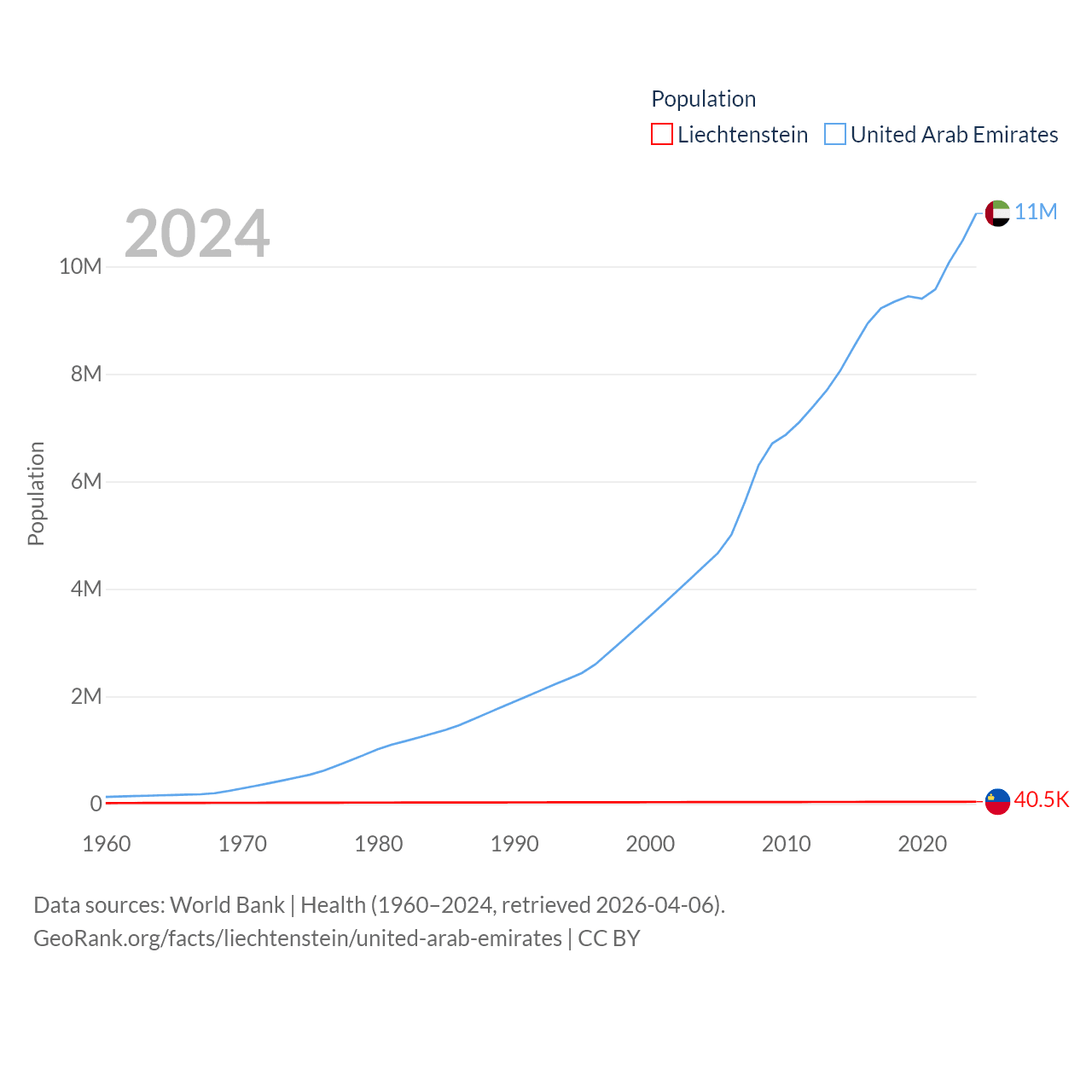 Liechtenstein has a population of 40.4K (ranked 190/197), compared with 11M in The United Arab Emirates (ranked 86/197). Liechtenstein's land area is 61.8 sq mi versus 27,421 sq mi for The United Arab Emirates (ranked 192nd vs. 117th).
