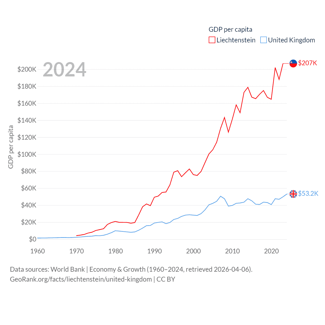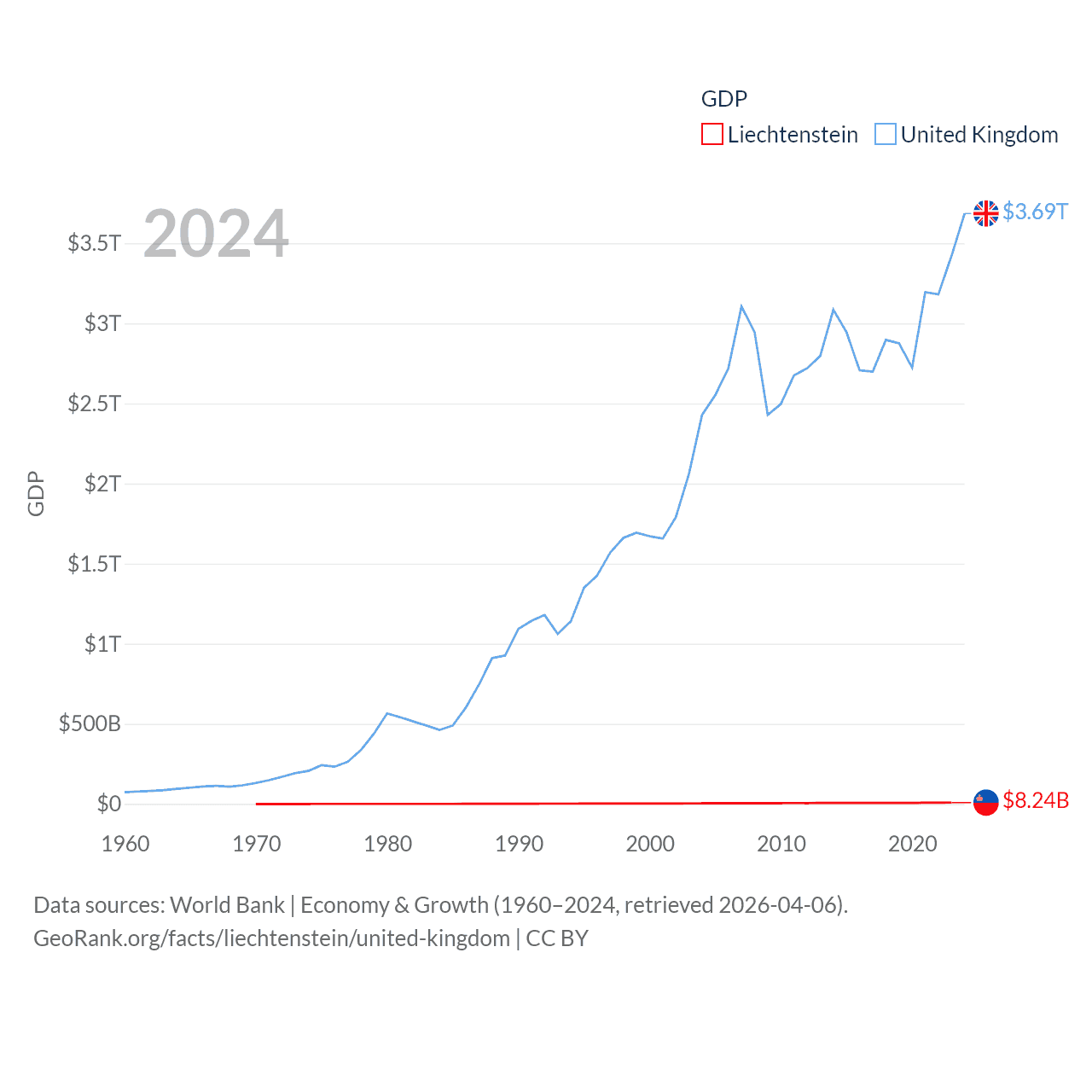 By GDP, Liechtenstein ranks 156/197 ($8.24B) and The United Kingdom ranks 6/197 ($3.69T). By GDP per capita, Liechtenstein ranks 2/197 ($206,781), while The United Kingdom ranks 22/197 ($53,246).