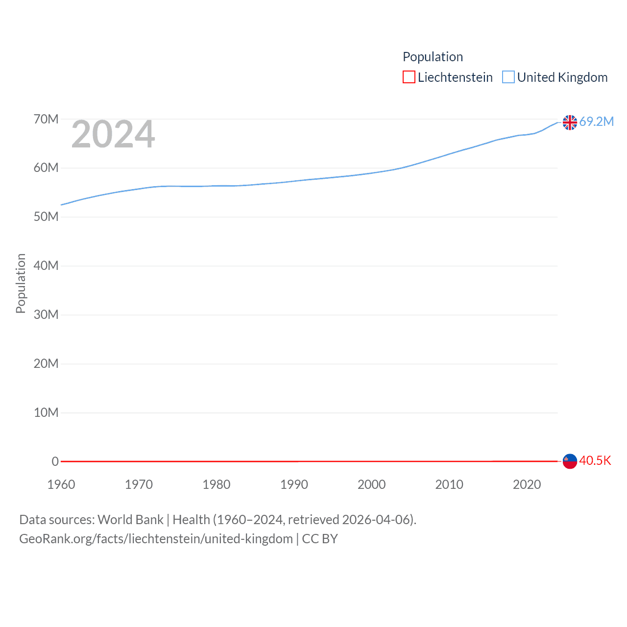 Liechtenstein has a population of 40.4K (ranked 190/197), compared with 69.2M in The United Kingdom (ranked 21/197). Liechtenstein's land area is 61.8 sq mi versus 93,410 sq mi for The United Kingdom (ranked 192nd vs. 78th).