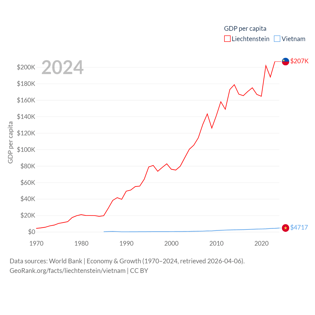 By GDP, Liechtenstein ranks 156/197 ($8.24B) and Vietnam ranks 33/197 ($476B). By GDP per capita, Liechtenstein ranks 2/197 ($206,781), while Vietnam ranks 122/197 ($4,717).