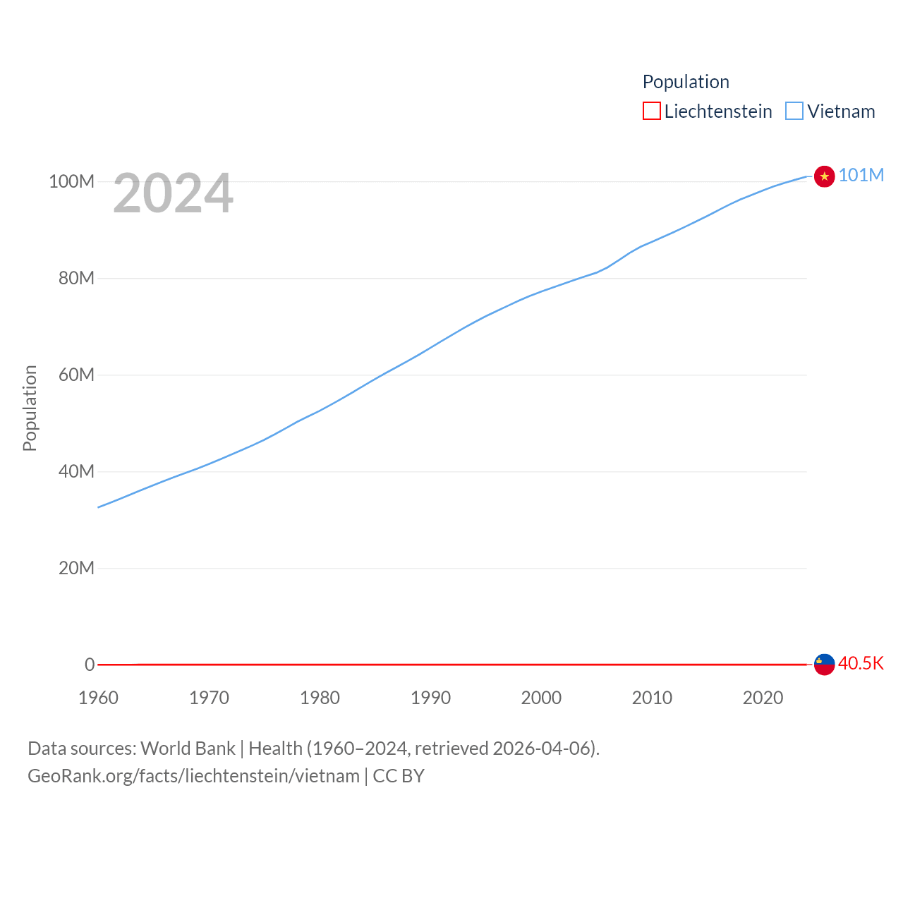 Liechtenstein has a population of 40.4K (ranked 190/197), compared with 101M in Vietnam (ranked 16/197). Liechtenstein's land area is 61.8 sq mi versus 121,016 sq mi for Vietnam (ranked 192nd vs. 67th).