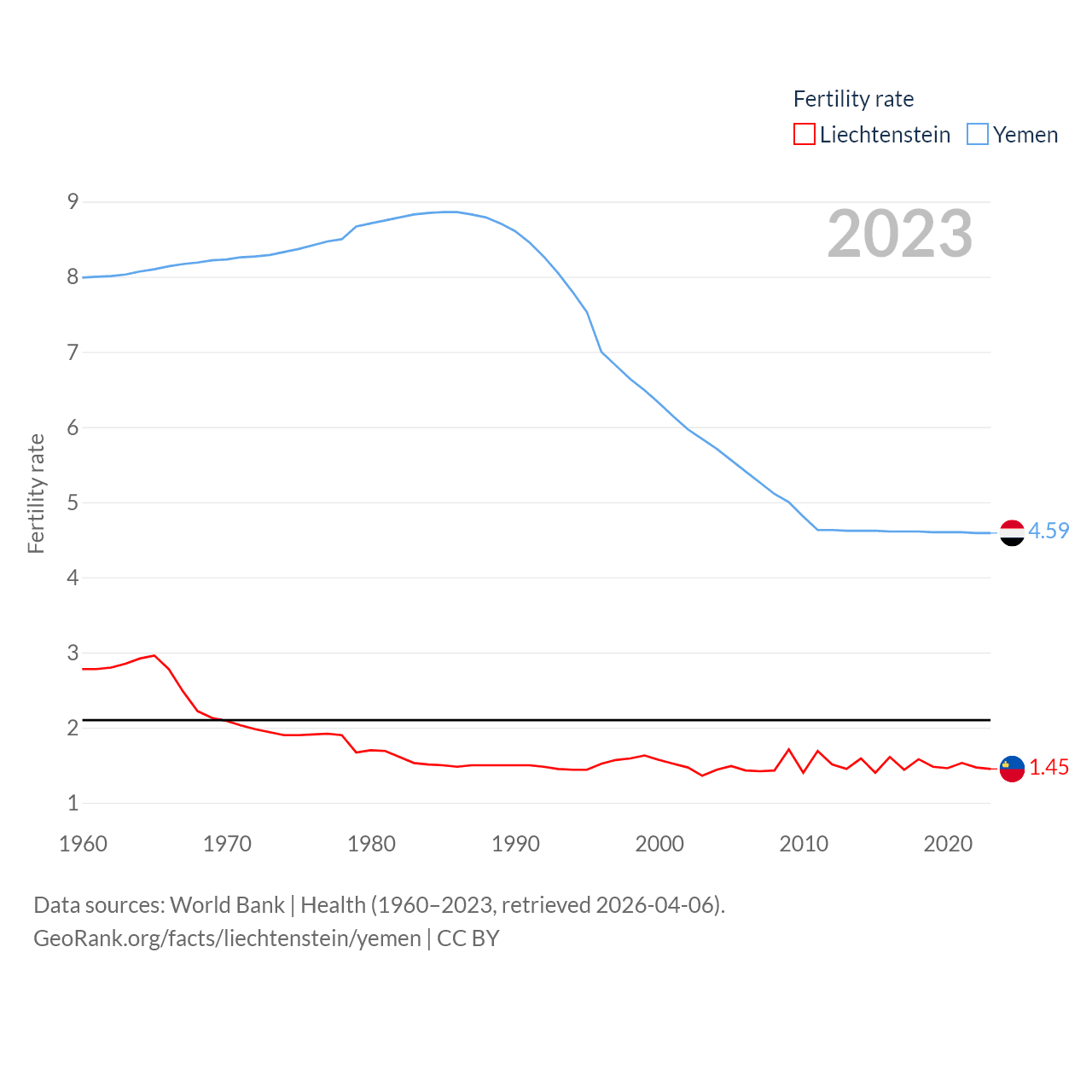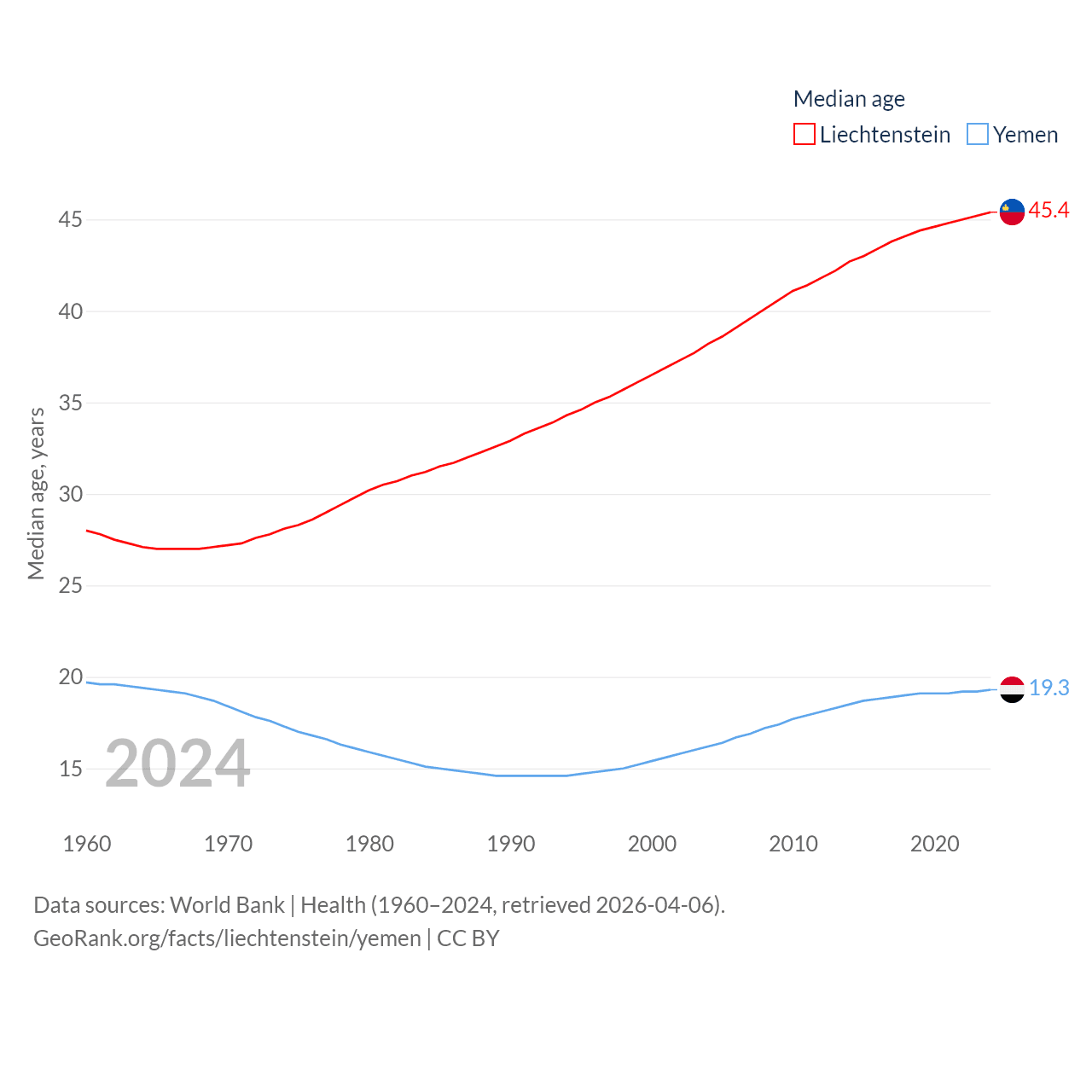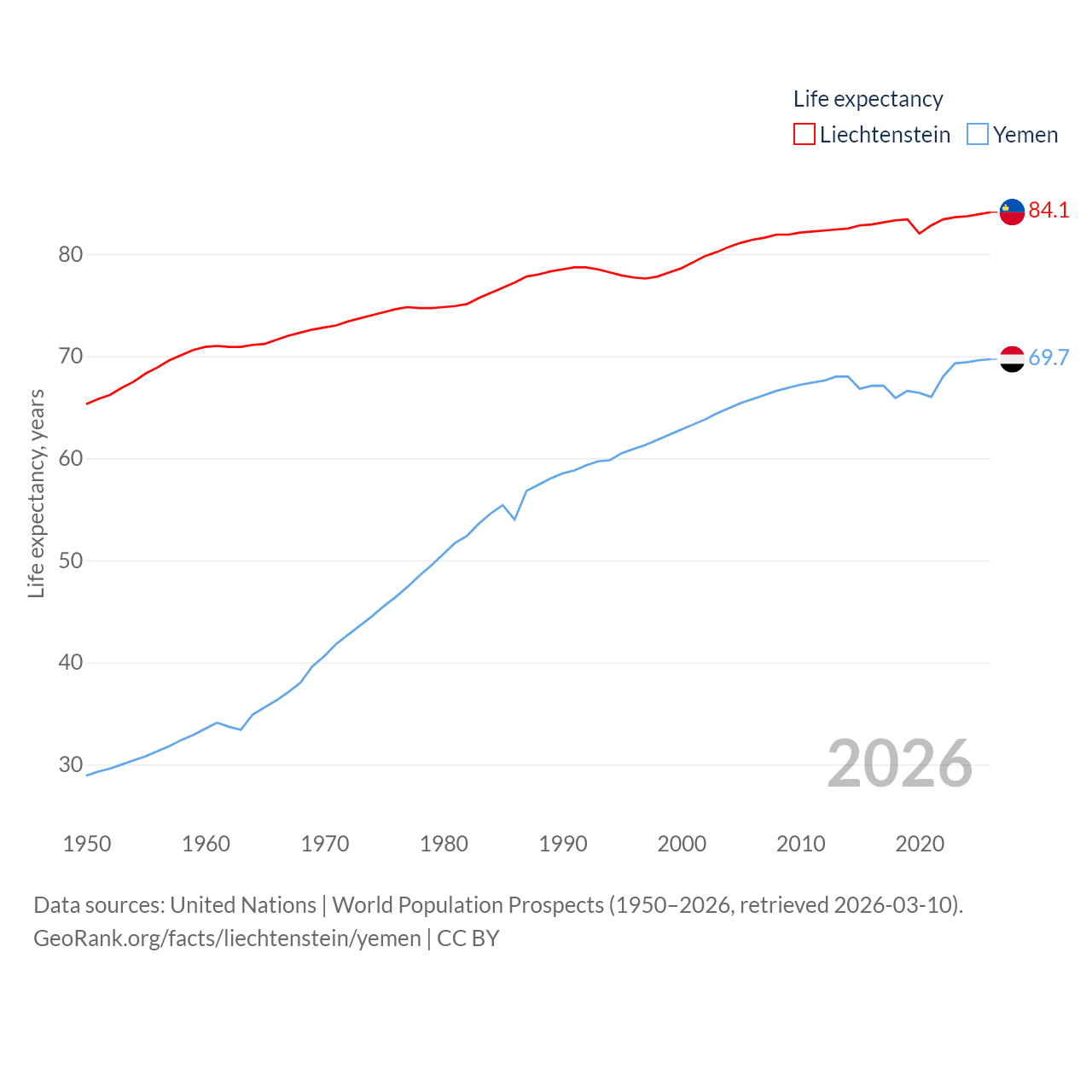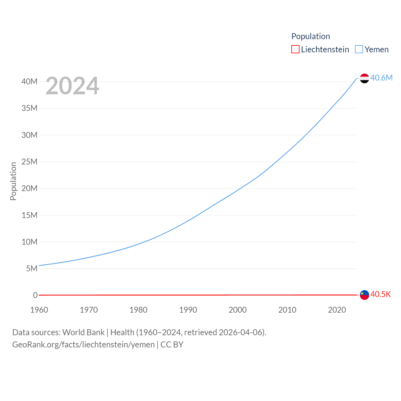 Liechtenstein has a population of 40.4K (ranked 190/197), compared with 40.6M in Yemen (ranked 38/197). Liechtenstein's land area is 61.8 sq mi versus 203,850 sq mi for Yemen (ranked 192nd vs. 49th).