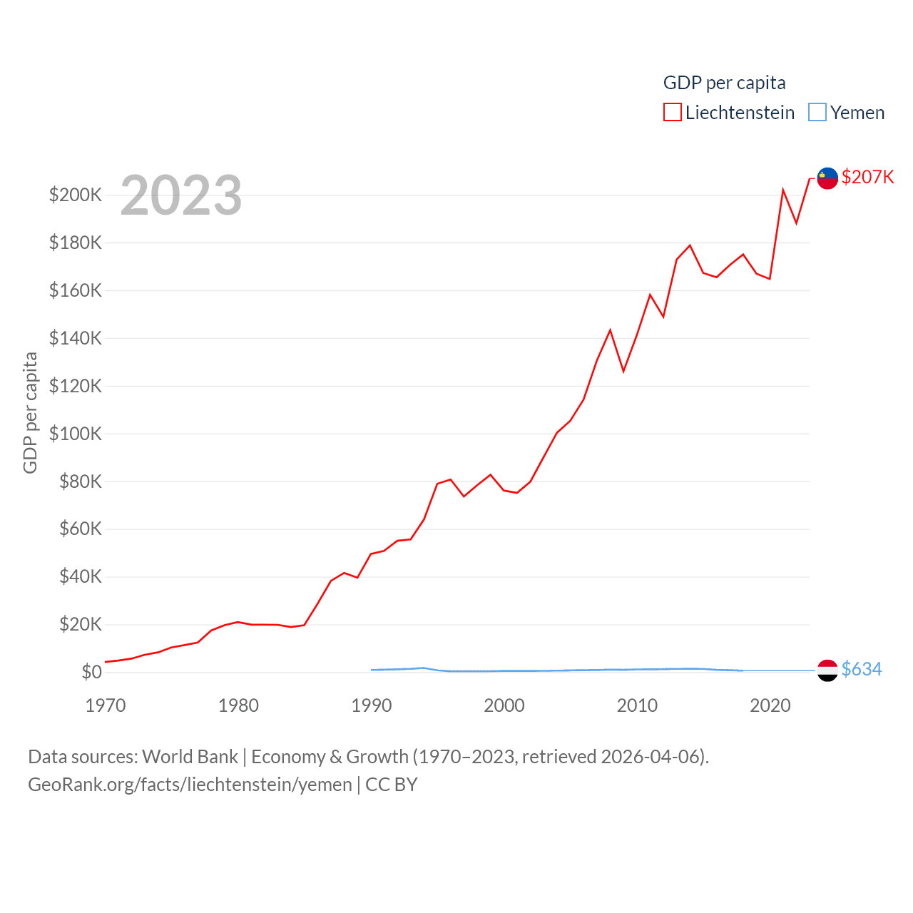 By GDP, Liechtenstein ranks 156/197 ($8.24B) and Yemen ranks 125/197 ($21.6B). By GDP per capita, Liechtenstein ranks 2/197 ($206,781), while Yemen ranks 191/197 ($634).