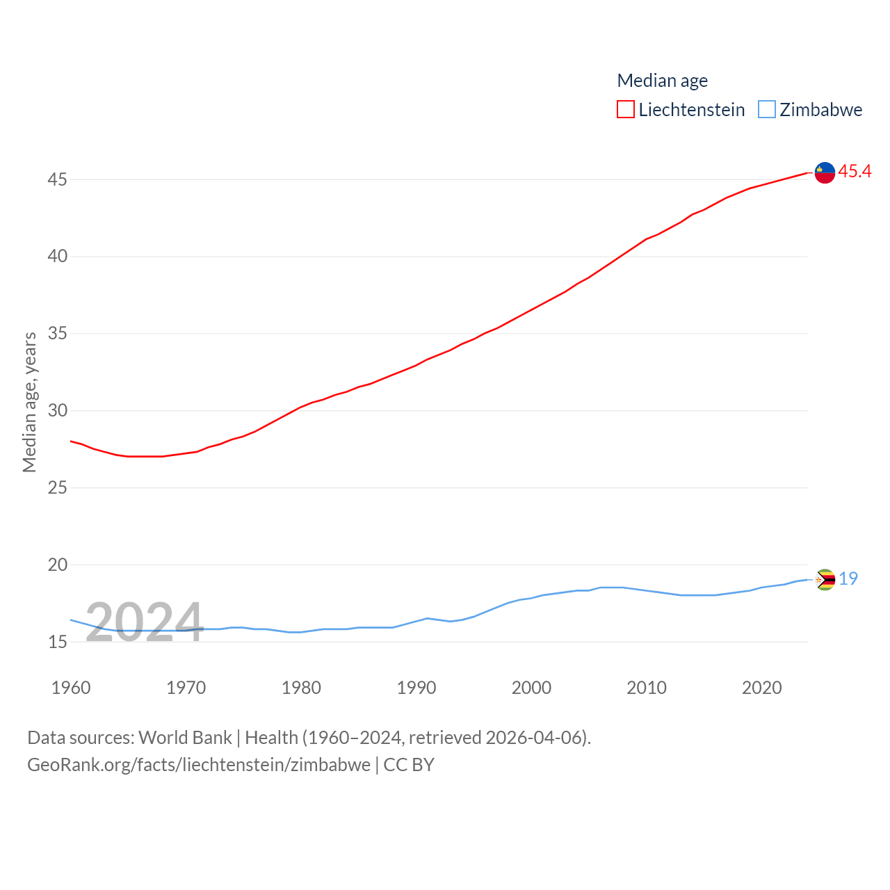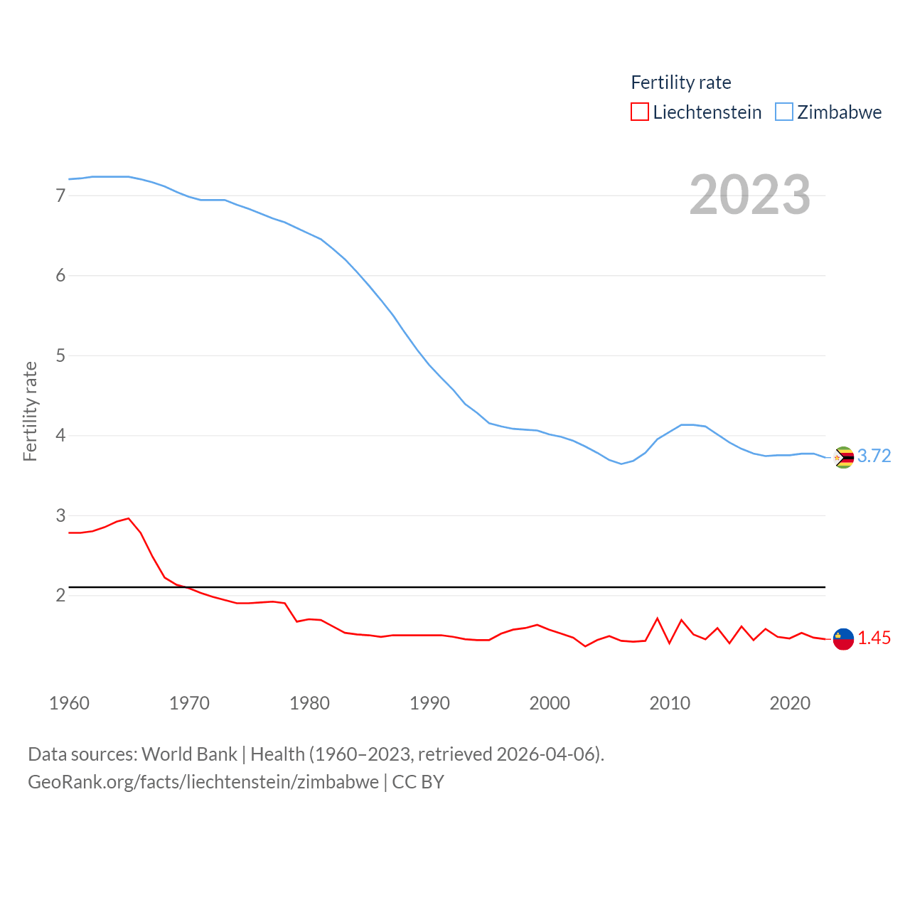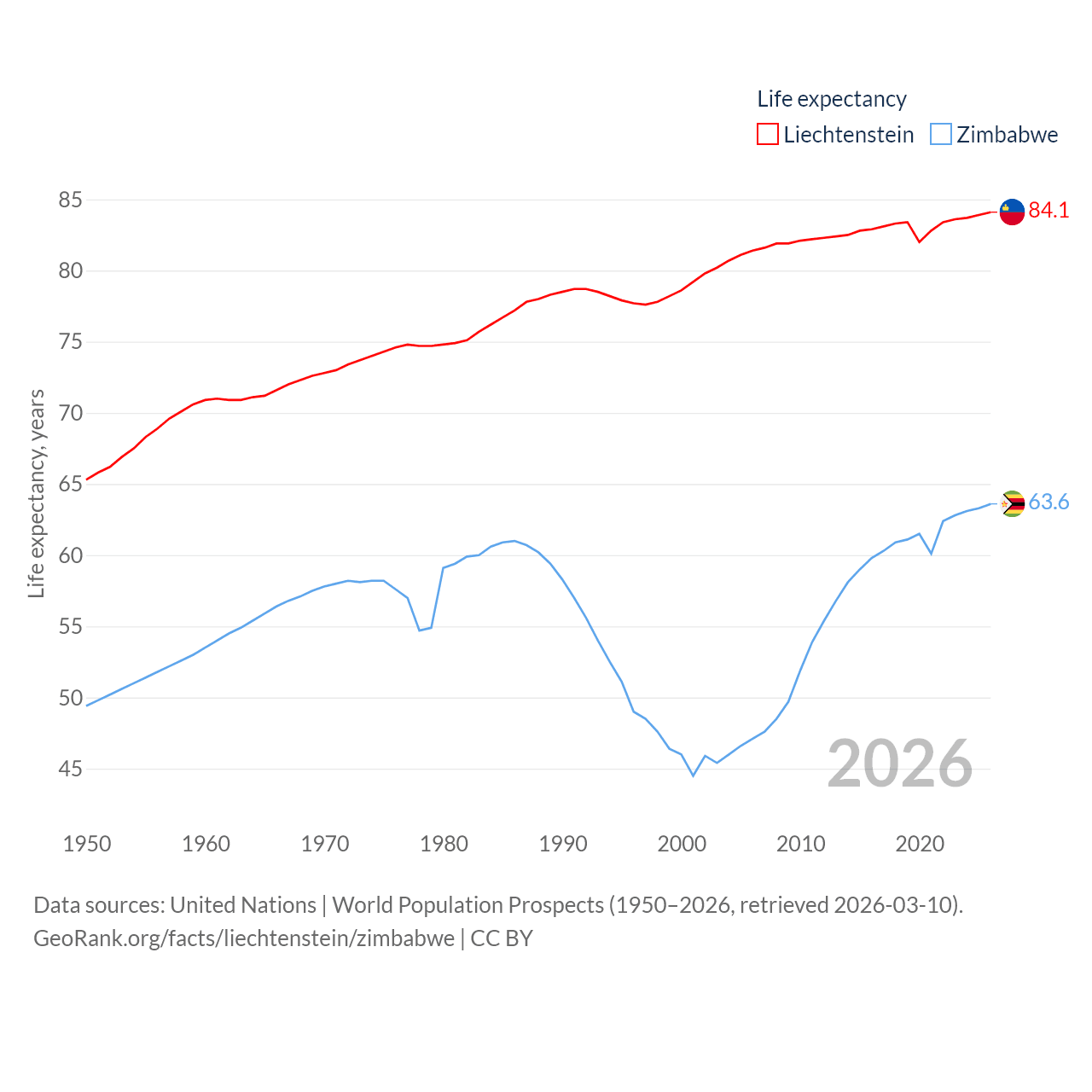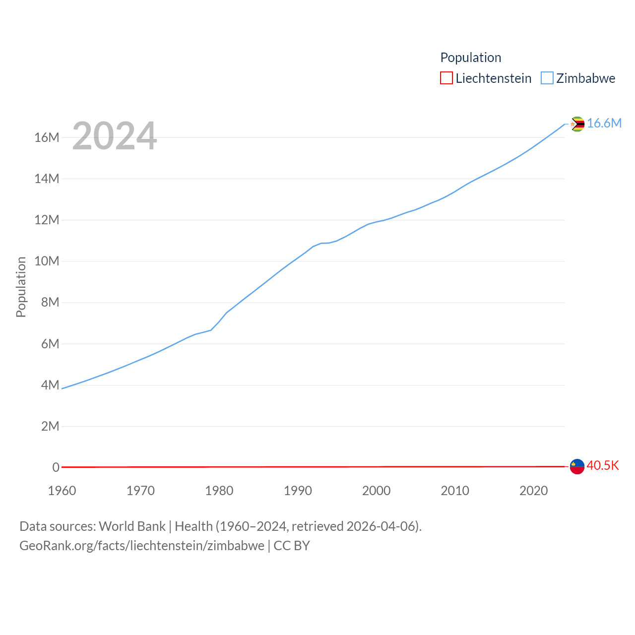 Liechtenstein has a population of 40.4K (ranked 190/197), compared with 16.6M in Zimbabwe (ranked 74/197). Liechtenstein's land area is 61.8 sq mi versus 149,364 sq mi for Zimbabwe (ranked 192nd vs. 60th).