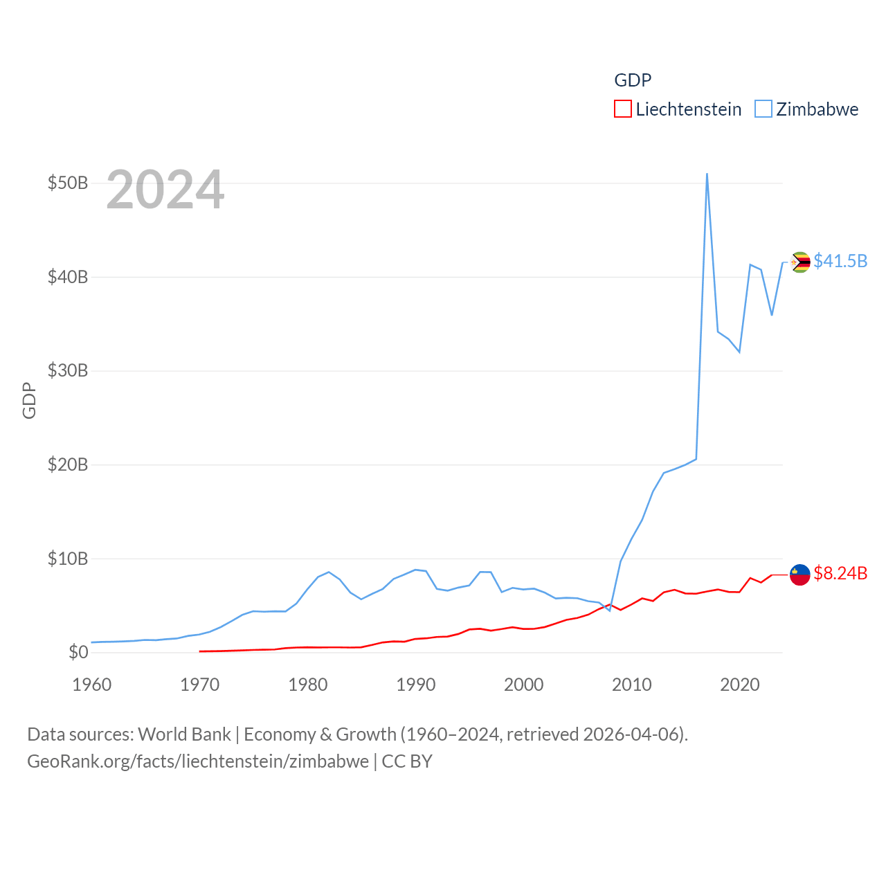 By GDP, Liechtenstein ranks 156/197 ($8.24B) and Zimbabwe ranks 102/197 ($41.5B). By GDP per capita, Liechtenstein ranks 2/197 ($206,781), while Zimbabwe ranks 148/197 ($2,497).