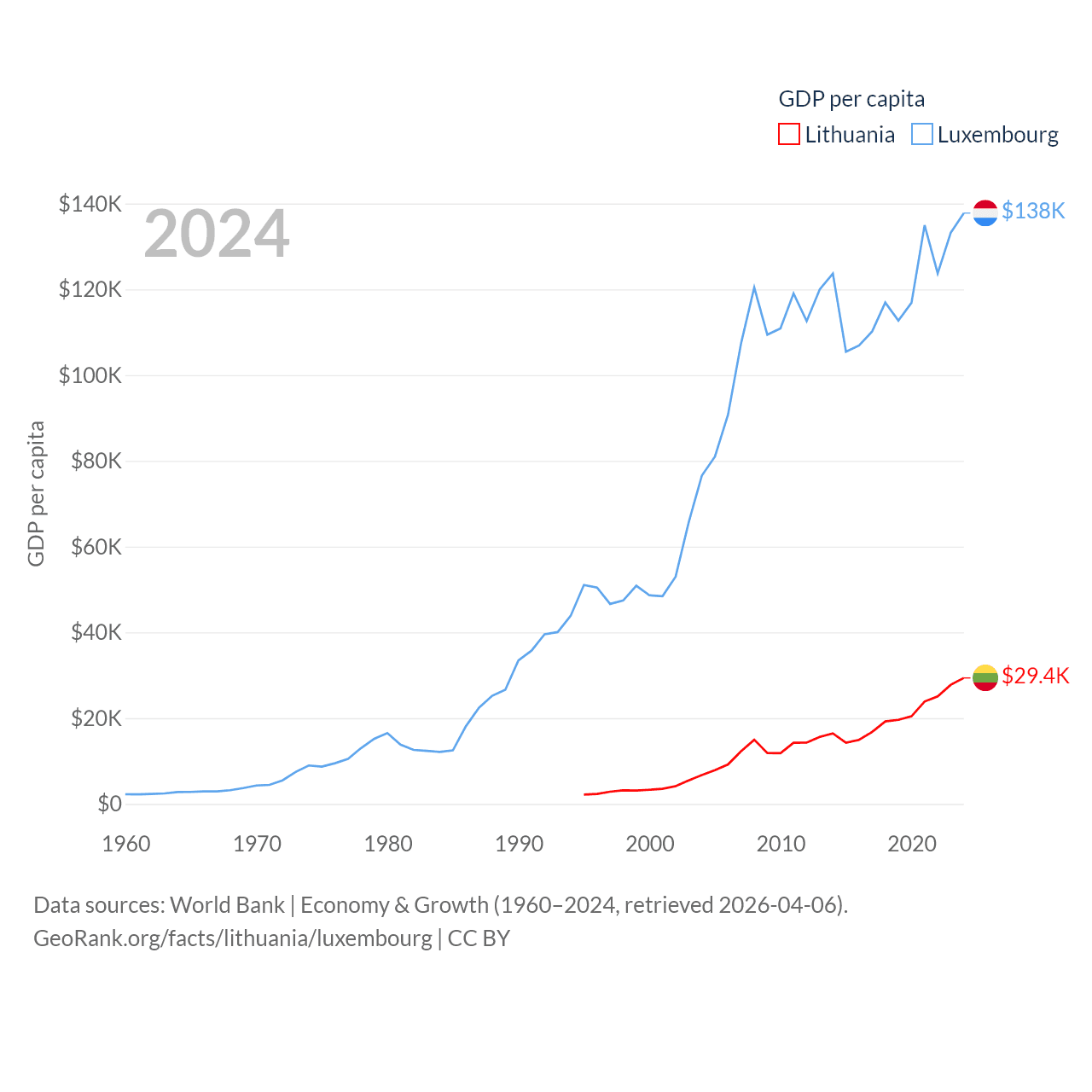 By GDP, Lithuania ranks 79/197 ($84.9B) and Luxembourg ranks 74/197 ($93.3B). By GDP per capita, Lithuania ranks 43/197 ($29,384), while Luxembourg ranks 3/197 ($137,782).