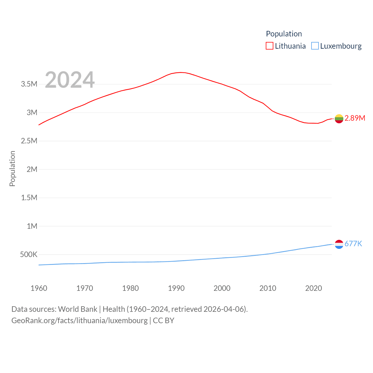 Lithuania has a population of 2.89M (ranked 137/197), compared with 677K in Luxembourg (ranked 164/197). Lithuania's land area is 24,170 sq mi versus 994 sq mi for Luxembourg (ranked 120th vs. 169th).