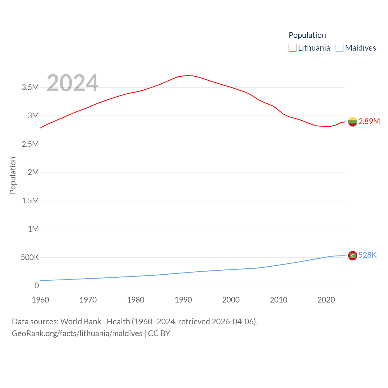 Lithuania has a population of 2.89M (ranked 137/197), compared with 528K in Maldives (ranked 168/197). Lithuania's land area is 24,170 sq mi versus 115.1 sq mi for Maldives (ranked 120th vs. 188th).