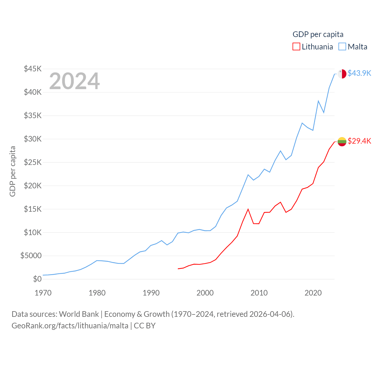 By GDP, Lithuania ranks 79/197 ($84.9B) and Malta ranks 119/197 ($25B). By GDP per capita, Lithuania ranks 43/197 ($29,384), while Malta ranks 28/197 ($43,899).