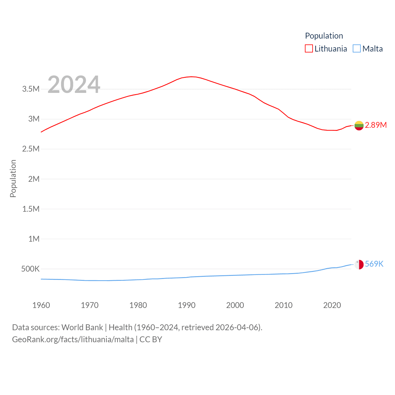 Lithuania has a population of 2.89M (ranked 137/197), compared with 569K in Malta (ranked 167/197). Lithuania's land area is 24,170 sq mi versus 123.6 sq mi for Malta (ranked 120th vs. 187th).