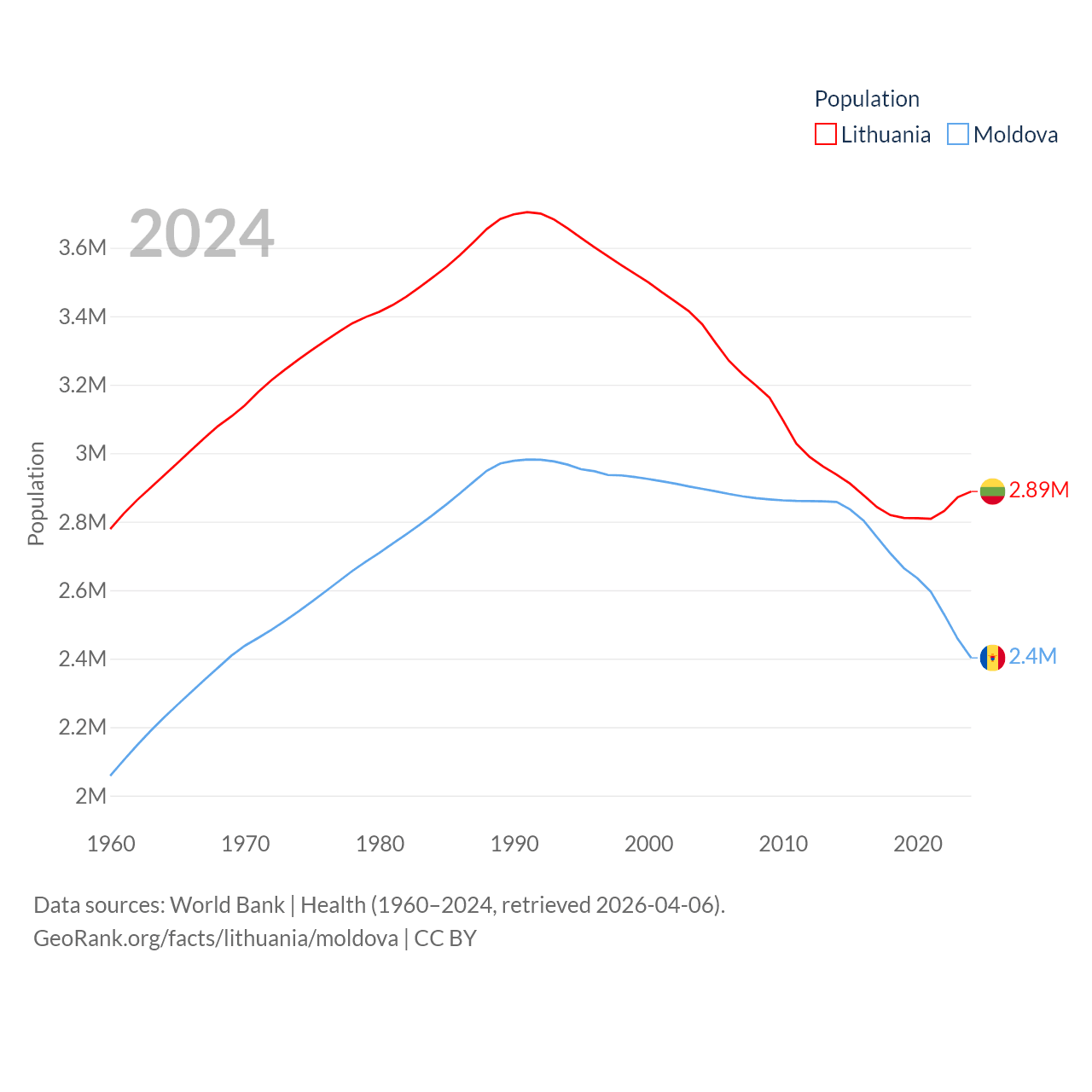 Lithuania has a population of 2.89M (ranked 137/197), compared with 2.4M in Moldova (ranked 143/197). Lithuania's land area is 24,170 sq mi versus 12,714 sq mi for Moldova (ranked 120th vs. 135th).