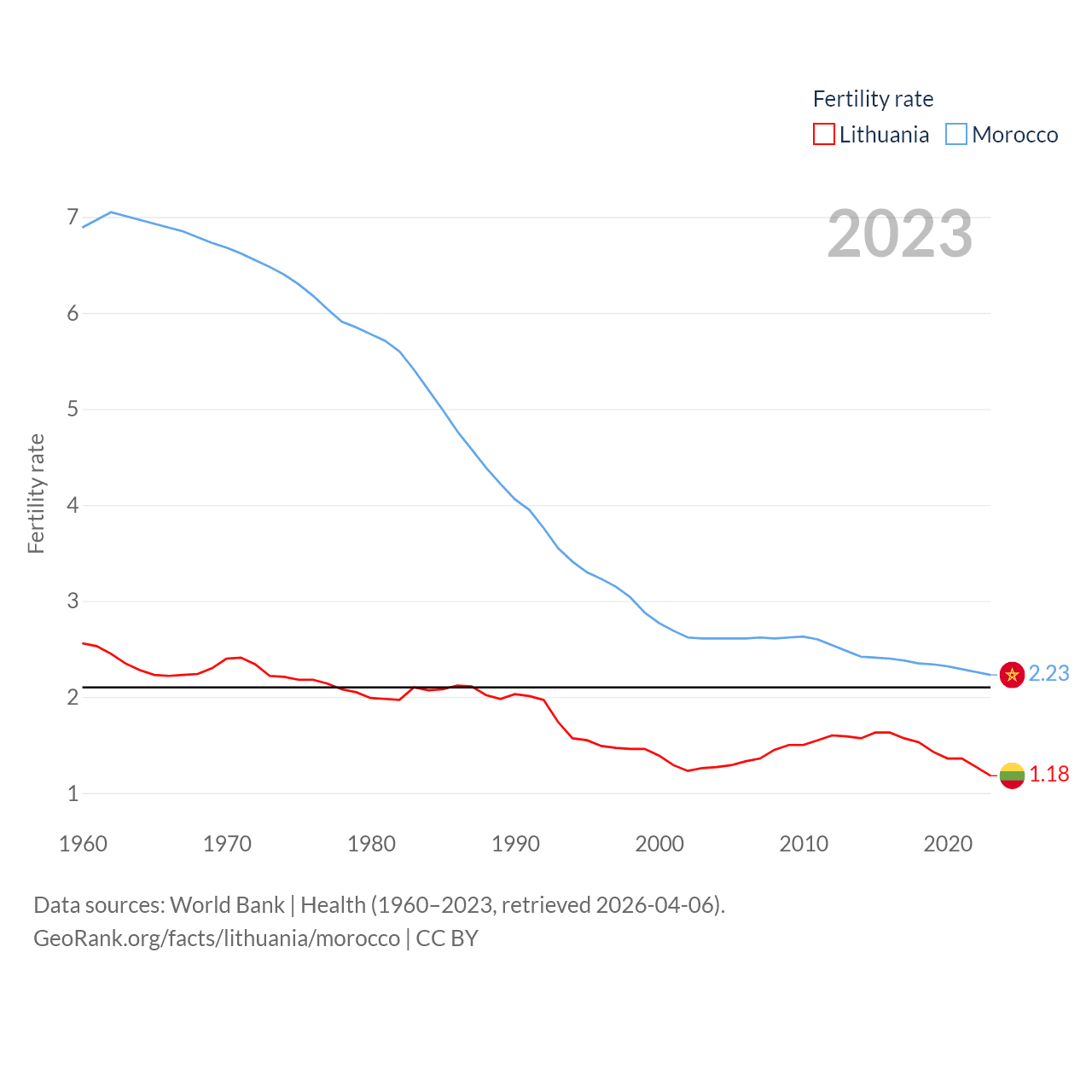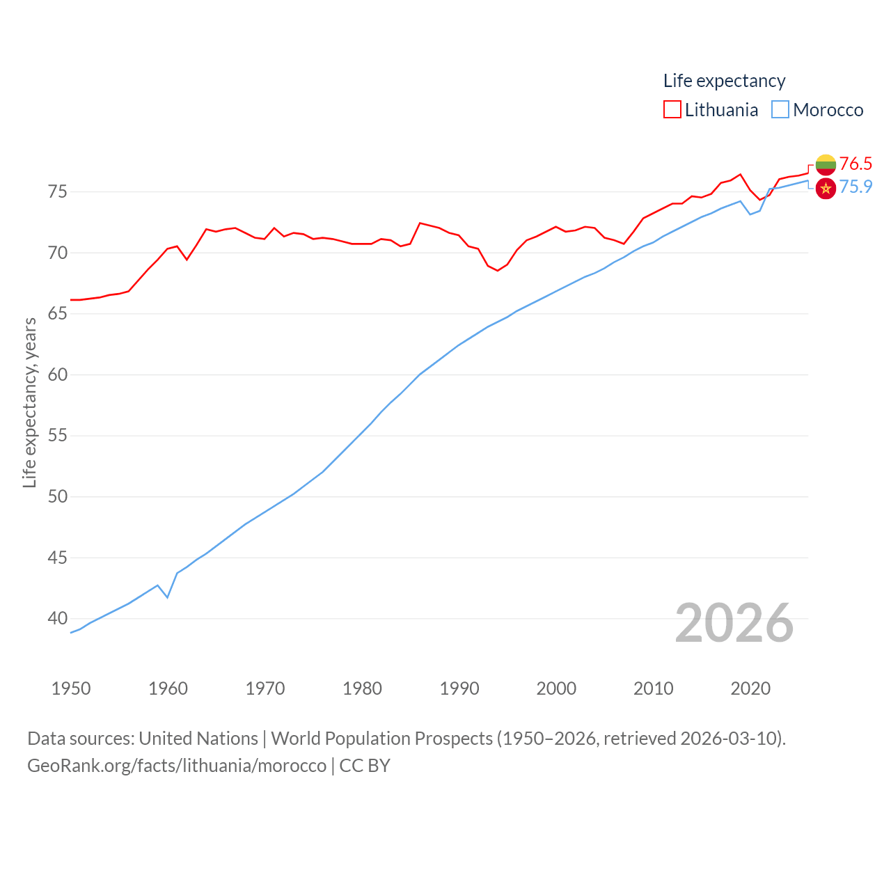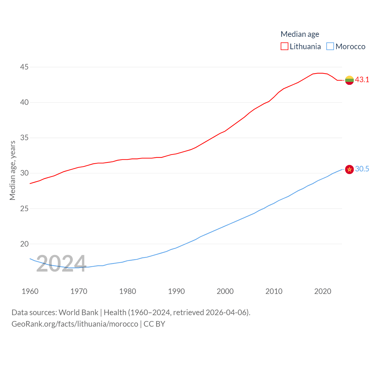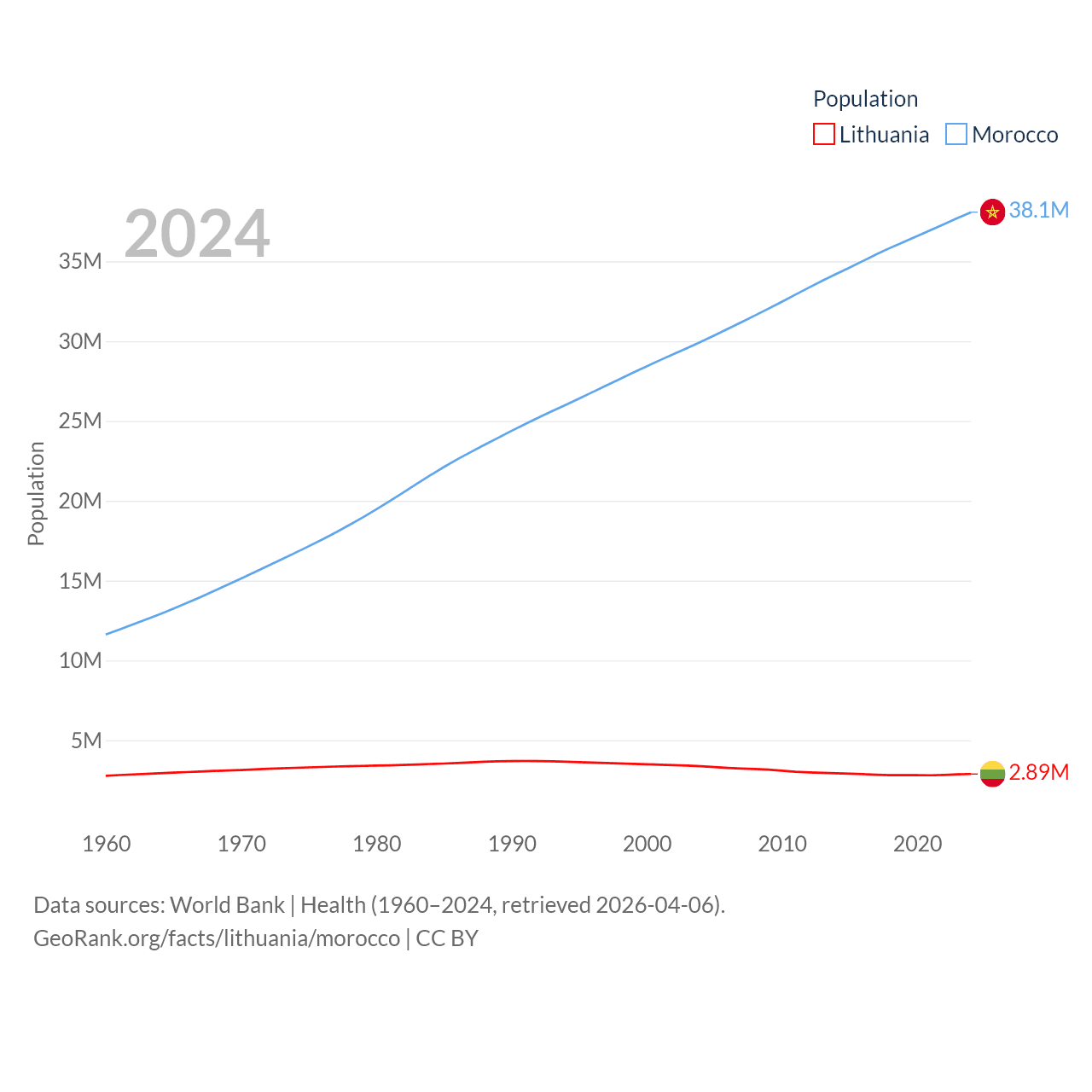 Lithuania has a population of 2.89M (ranked 137/197), compared with 38.1M in Morocco (ranked 39/197). Lithuania's land area is 24,170 sq mi versus 172,317 sq mi for Morocco (ranked 120th vs. 55th).