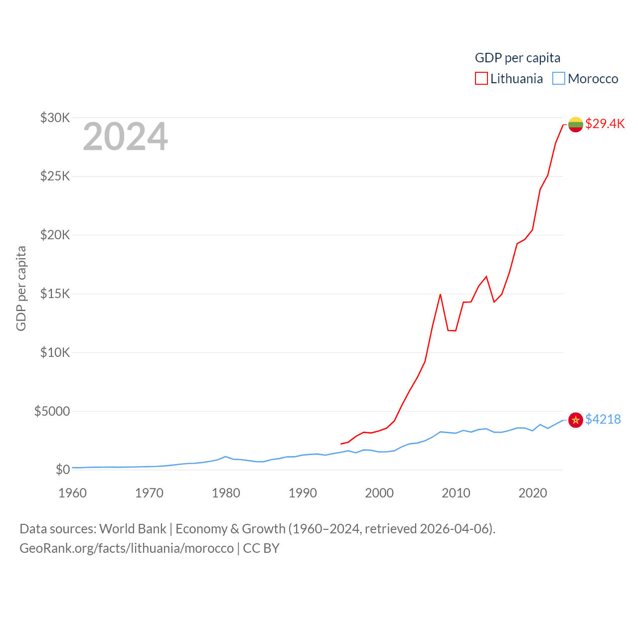 By GDP, Lithuania ranks 79/197 ($84.9B) and Morocco ranks 58/197 ($161B). By GDP per capita, Lithuania ranks 43/197 ($29,384), while Morocco ranks 127/197 ($4,218).