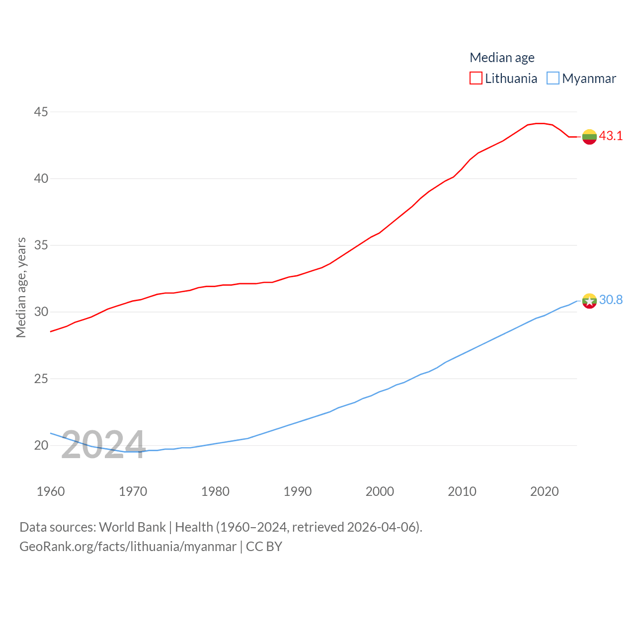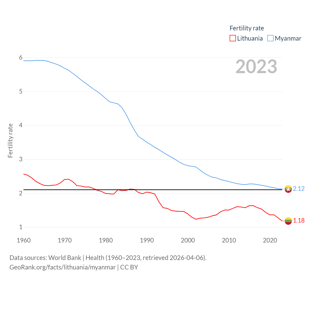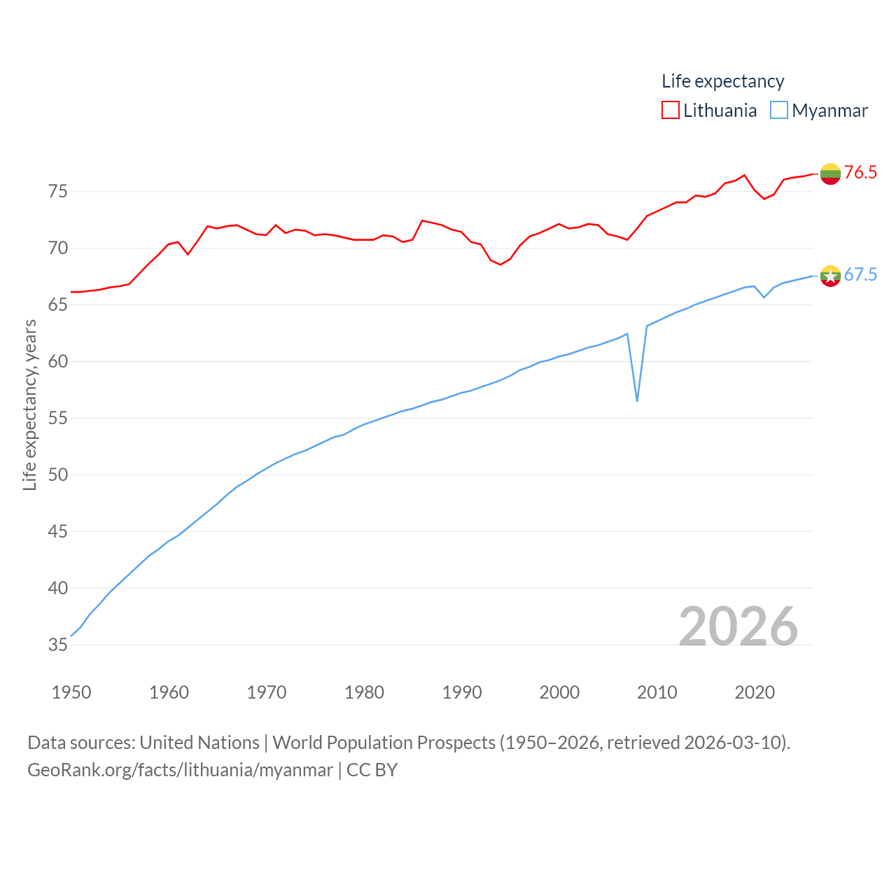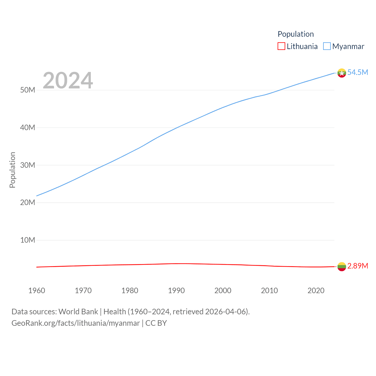 Lithuania has a population of 2.89M (ranked 137/197), compared with 54.5M in Myanmar (ranked 27/197). Lithuania's land area is 24,170 sq mi versus 251,997 sq mi for Myanmar (ranked 120th vs. 39th).