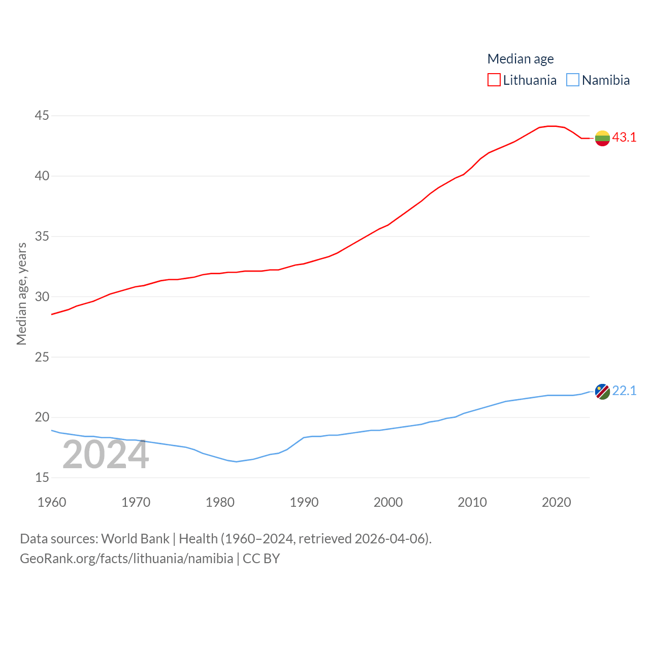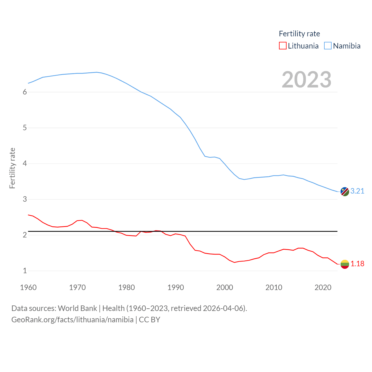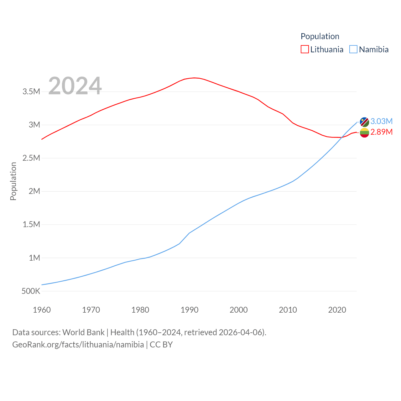 Lithuania has a population of 2.89M (ranked 137/197), compared with 3.03M in Namibia (ranked 136/197). Lithuania's land area is 24,170 sq mi versus 317,874 sq mi for Namibia (ranked 120th vs. 33rd).