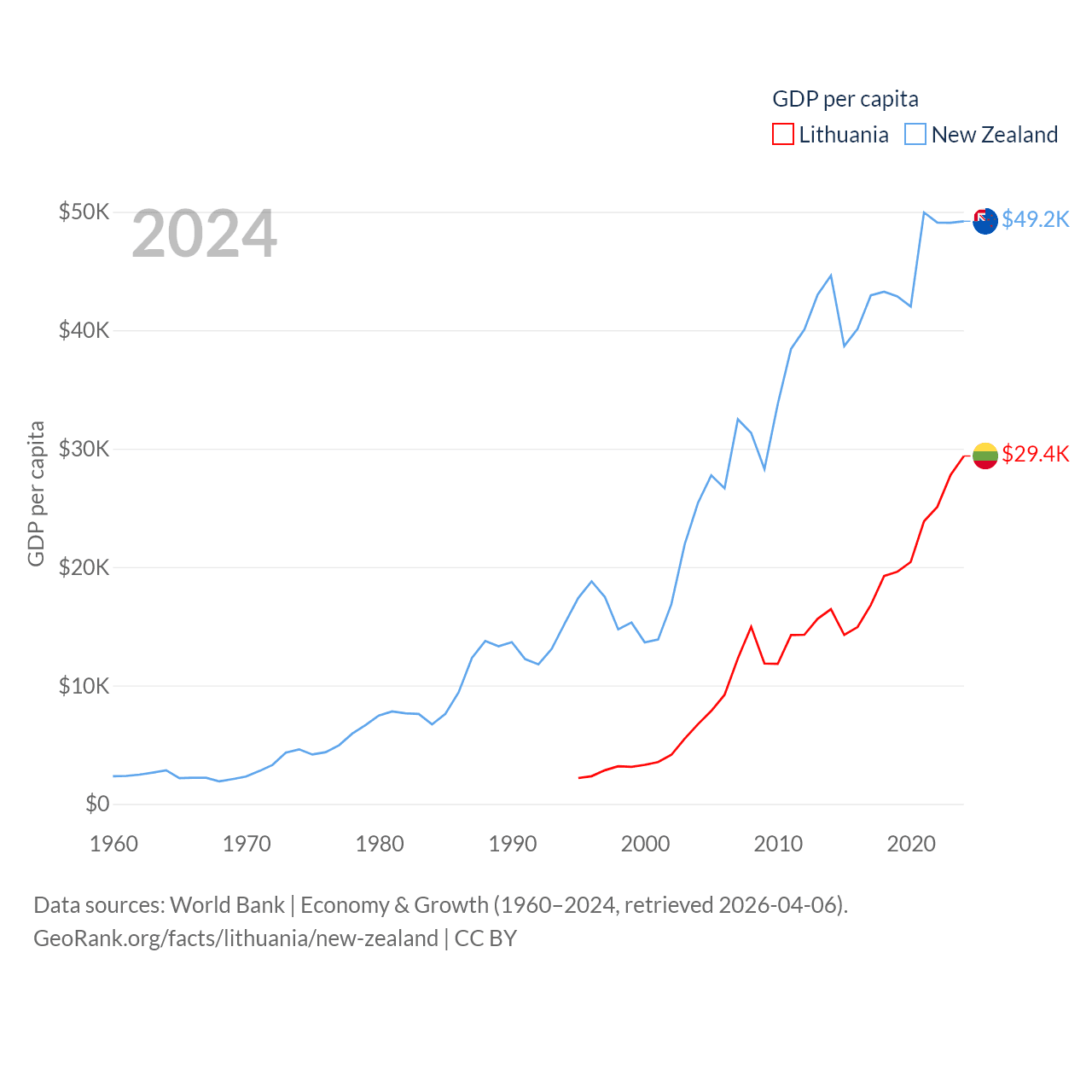 By GDP, Lithuania ranks 79/197 ($84.9B) and New Zealand ranks 52/197 ($260B). By GDP per capita, Lithuania ranks 43/197 ($29,384), while New Zealand ranks 26/197 ($49,205).