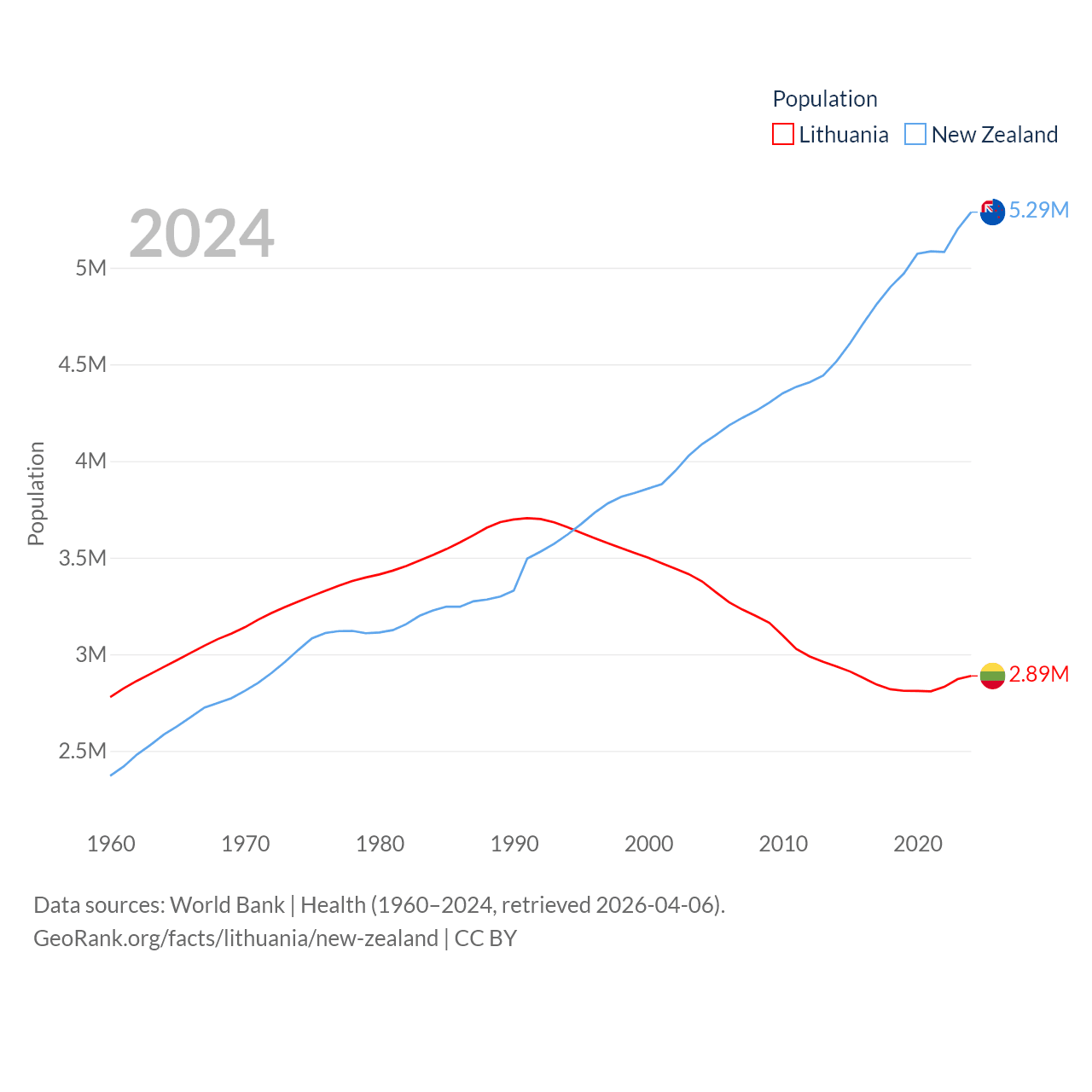 Lithuania has a population of 2.89M (ranked 137/197), compared with 5.29M in New Zealand (ranked 123/197). Lithuania's land area is 24,170 sq mi versus 101,665 sq mi for New Zealand (ranked 120th vs. 74th).