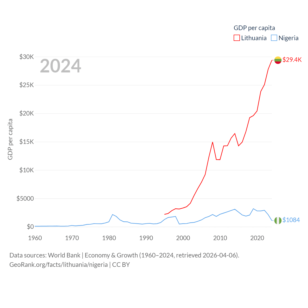By GDP, Lithuania ranks 79/197 ($84.9B) and Nigeria ranks 54/197 ($252B). By GDP per capita, Lithuania ranks 43/197 ($29,384), while Nigeria ranks 174/197 ($1,084).