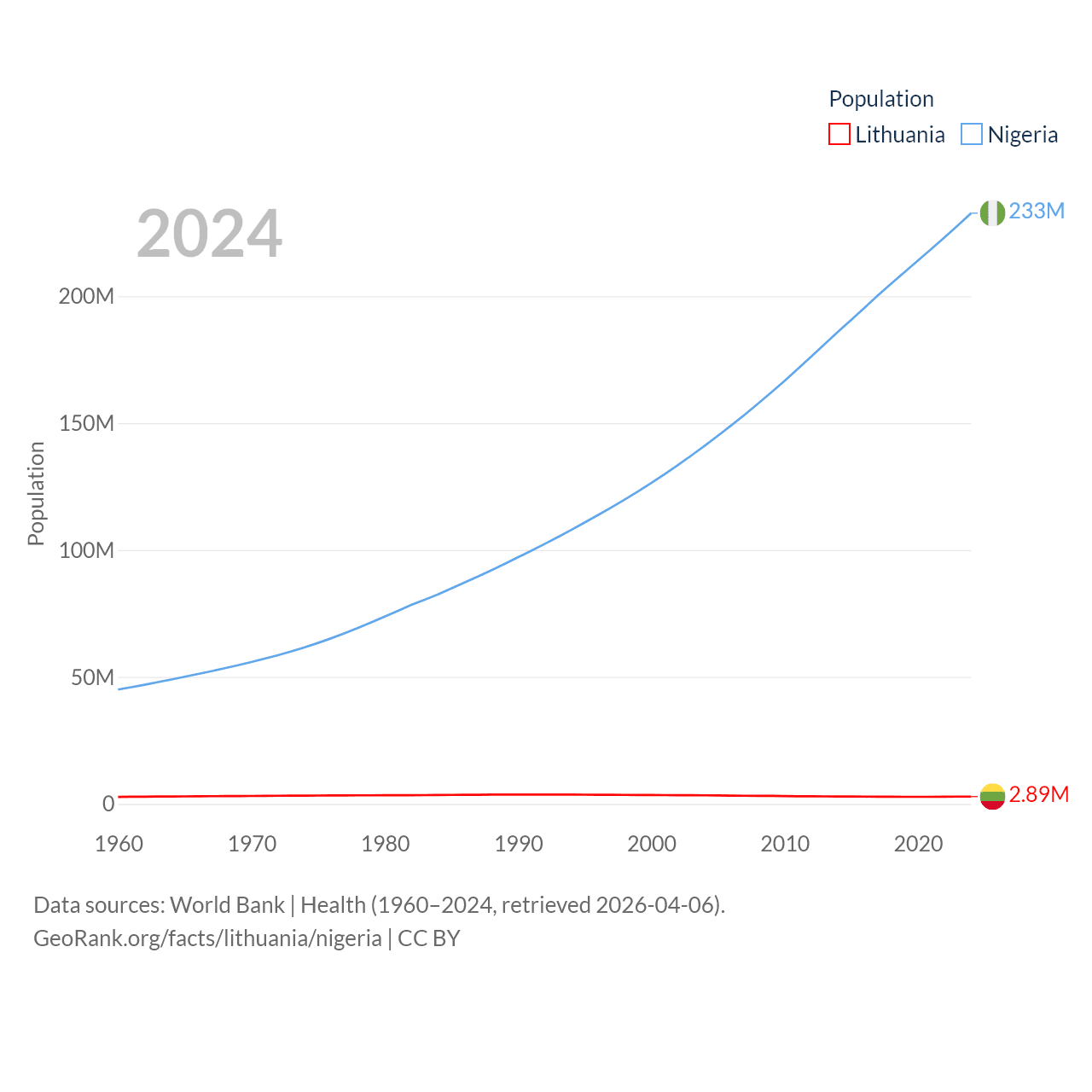 Lithuania has a population of 2.89M (ranked 137/197), compared with 233M in Nigeria (ranked 6/197). Lithuania's land area is 24,170 sq mi versus 351,650 sq mi for Nigeria (ranked 120th vs. 30th).