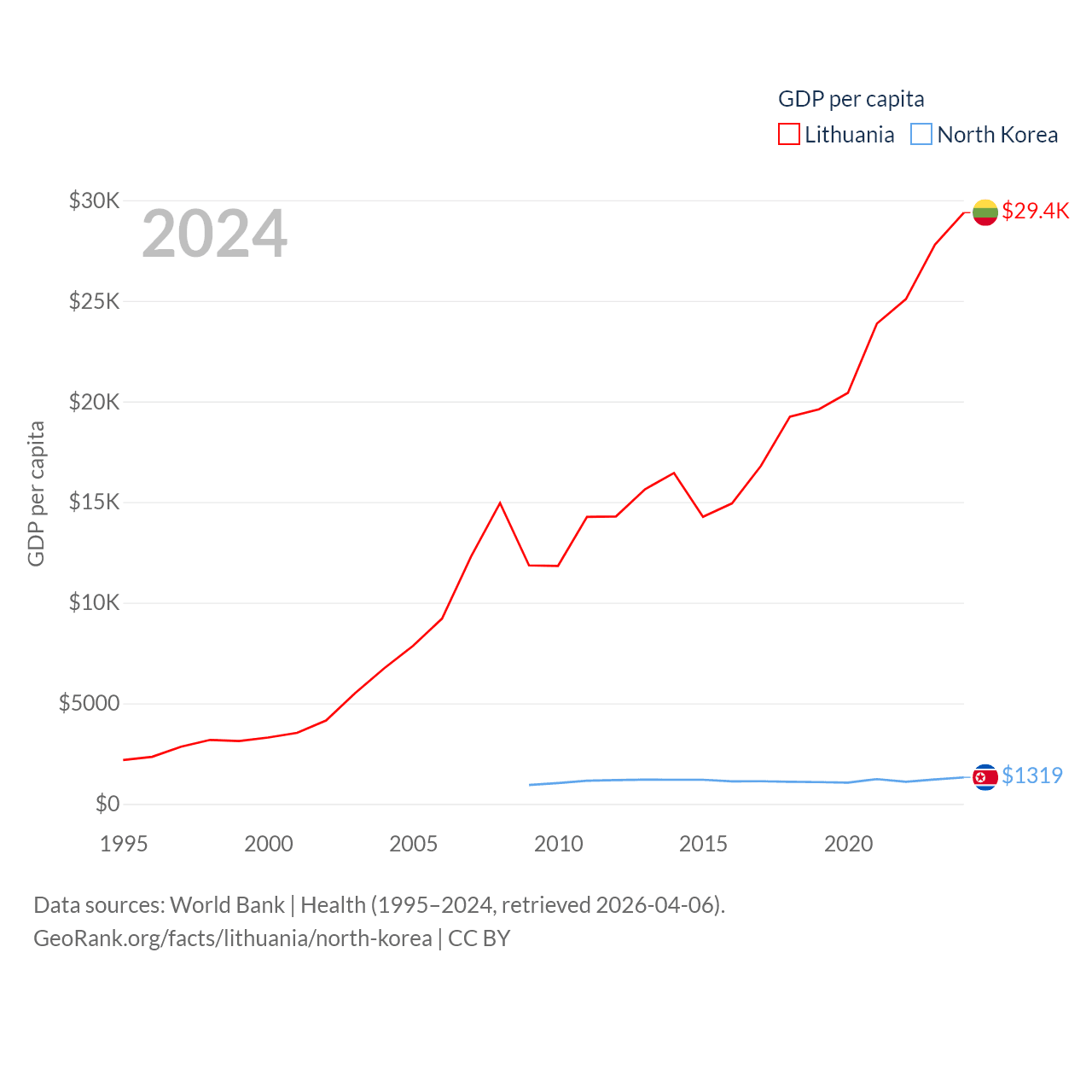 By GDP, Lithuania ranks 79/197 ($84.9B) and North Korea ranks 106/197 ($34.9B). By GDP per capita, Lithuania ranks 43/197 ($29,384), while North Korea ranks 168/197 ($1,319).