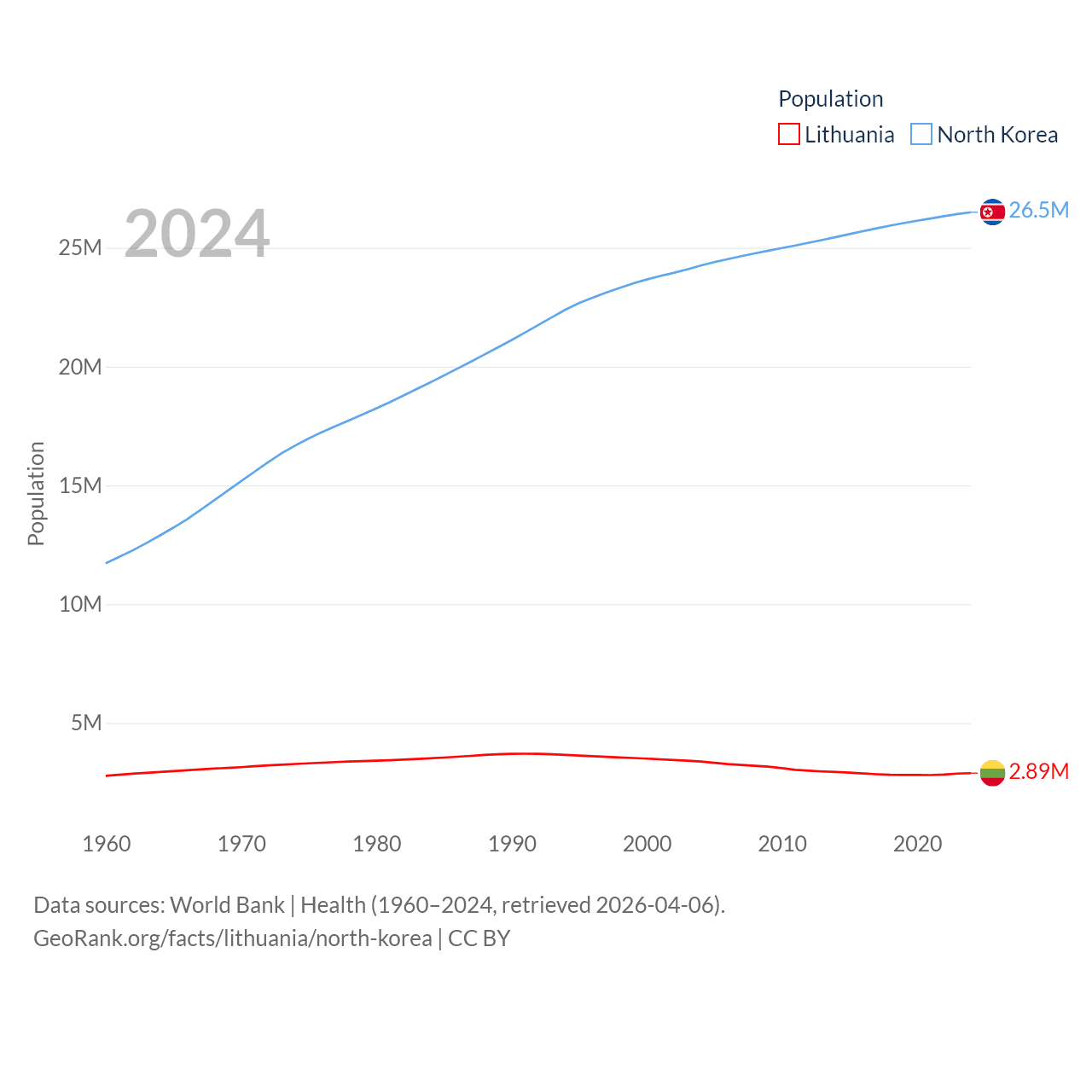 Lithuania has a population of 2.89M (ranked 137/197), compared with 26.5M in North Korea (ranked 56/197). Lithuania's land area is 24,170 sq mi versus 46,491 sq mi for North Korea (ranked 120th vs. 97th).
