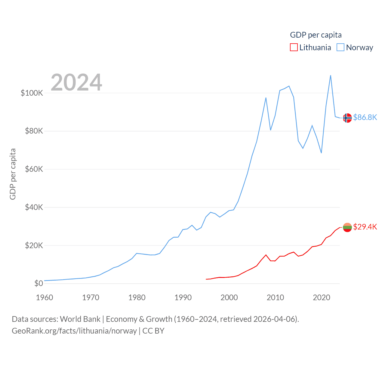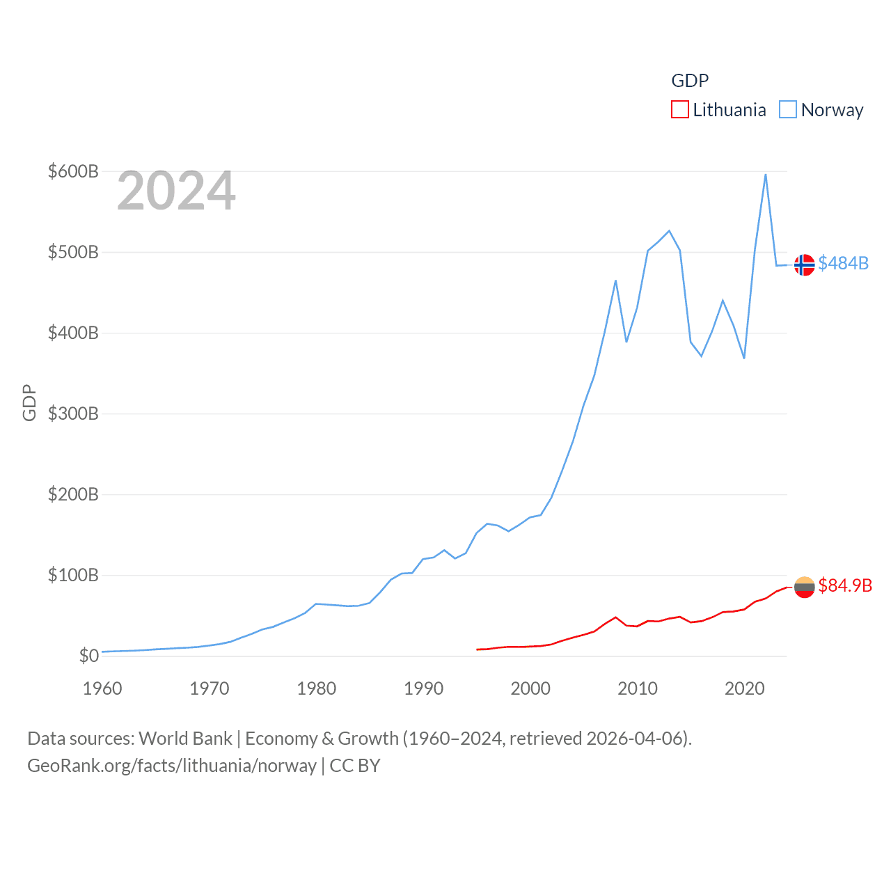 By GDP, Lithuania ranks 79/197 ($84.9B) and Norway ranks 32/197 ($484B). By GDP per capita, Lithuania ranks 43/197 ($29,384), while Norway ranks 8/197 ($86,785).