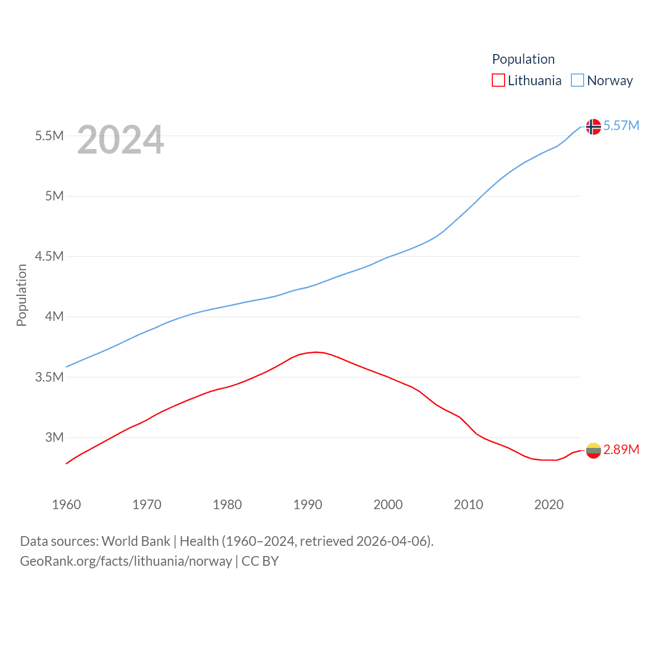 Lithuania has a population of 2.89M (ranked 137/197), compared with 5.57M in Norway (ranked 118/197). Lithuania's land area is 24,170 sq mi versus 140,645 sq mi for Norway (ranked 120th vs. 62nd).