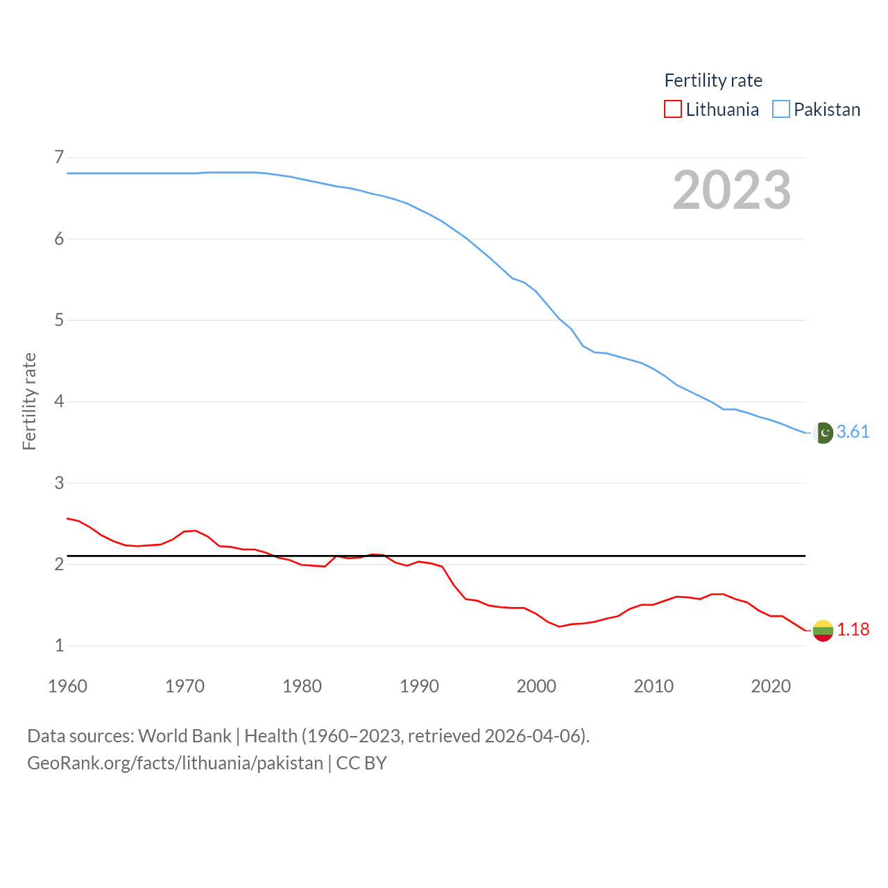 Lithuania has a population of 2.89M (ranked 137/197), compared with 251M in Pakistan (ranked 5/197). Lithuania's land area is 24,170 sq mi versus 297,638 sq mi for Pakistan (ranked 120th vs. 35th).