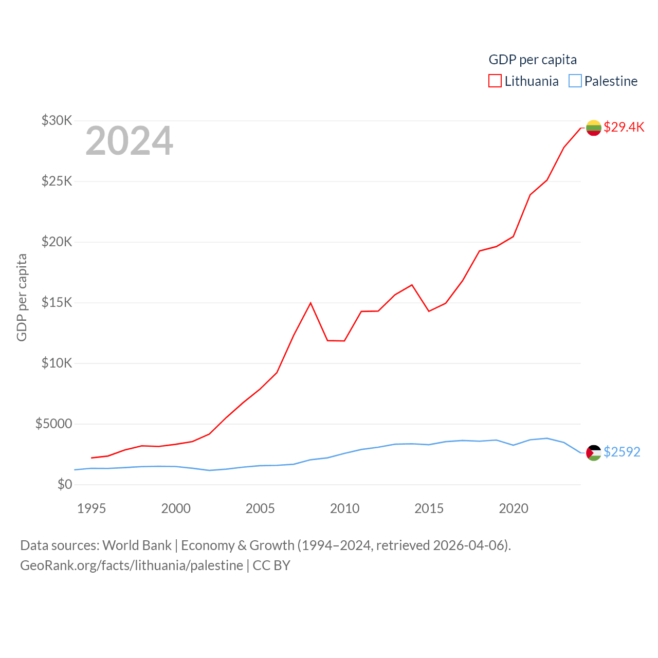 By GDP, Lithuania ranks 79/197 ($84.9B) and Palestine ranks 146/197 ($13.7B). By GDP per capita, Lithuania ranks 43/197 ($29,384), while Palestine ranks 147/197 ($2,592).