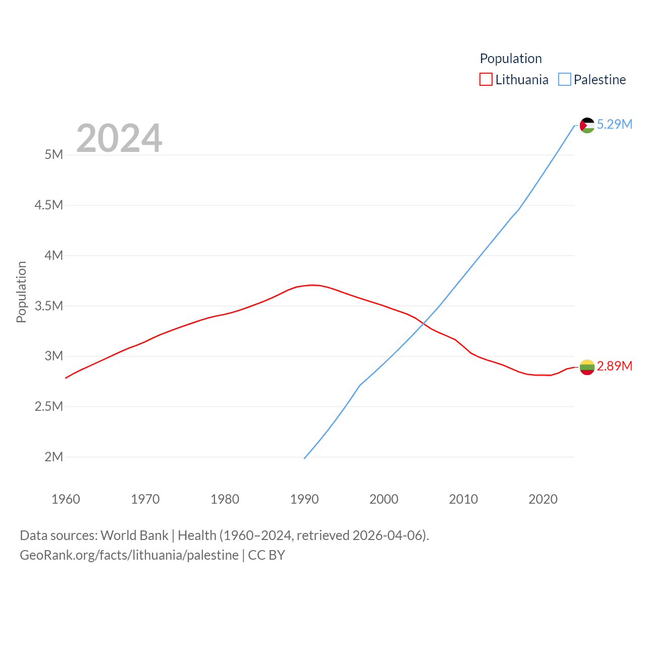 Lithuania has a population of 2.89M (ranked 137/197), compared with 5.29M in Palestine (ranked 122/197). Lithuania's land area is 24,170 sq mi versus 2,326 sq mi for Palestine (ranked 120th vs. 164th).