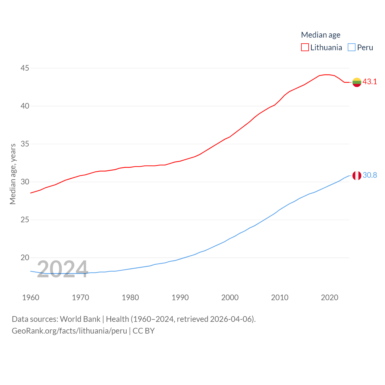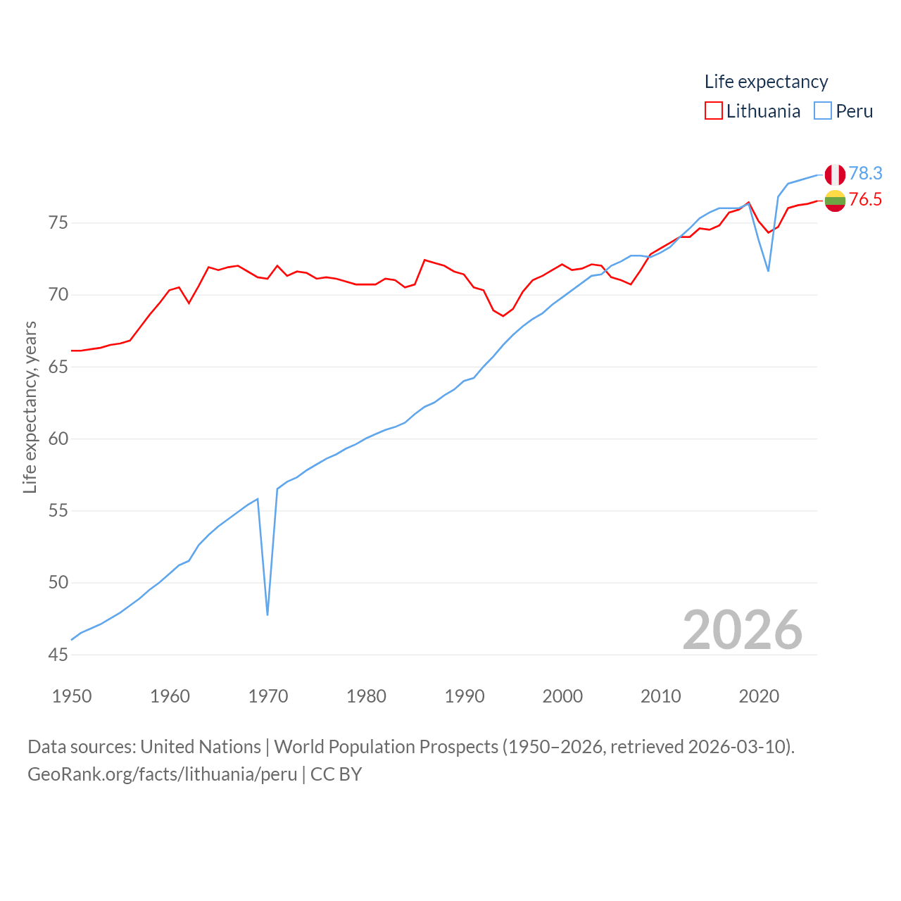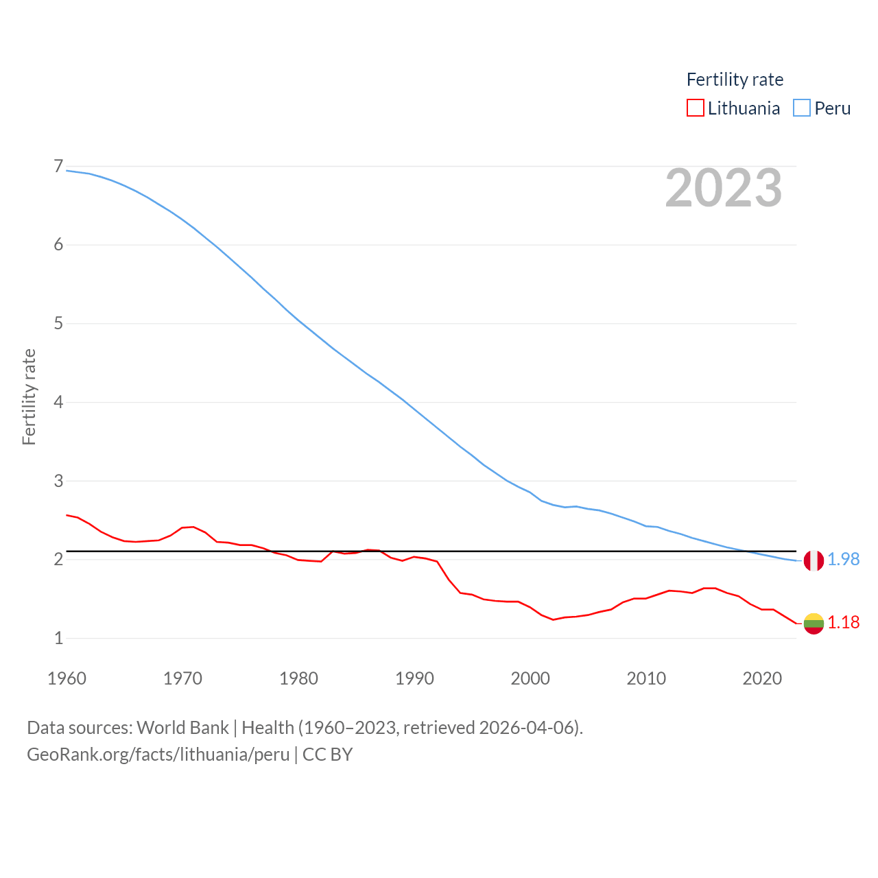 Lithuania has a population of 2.89M (ranked 137/197), compared with 34.2M in Peru (ranked 48/197). Lithuania's land area is 24,170 sq mi versus 494,211 sq mi for Peru (ranked 120th vs. 19th).