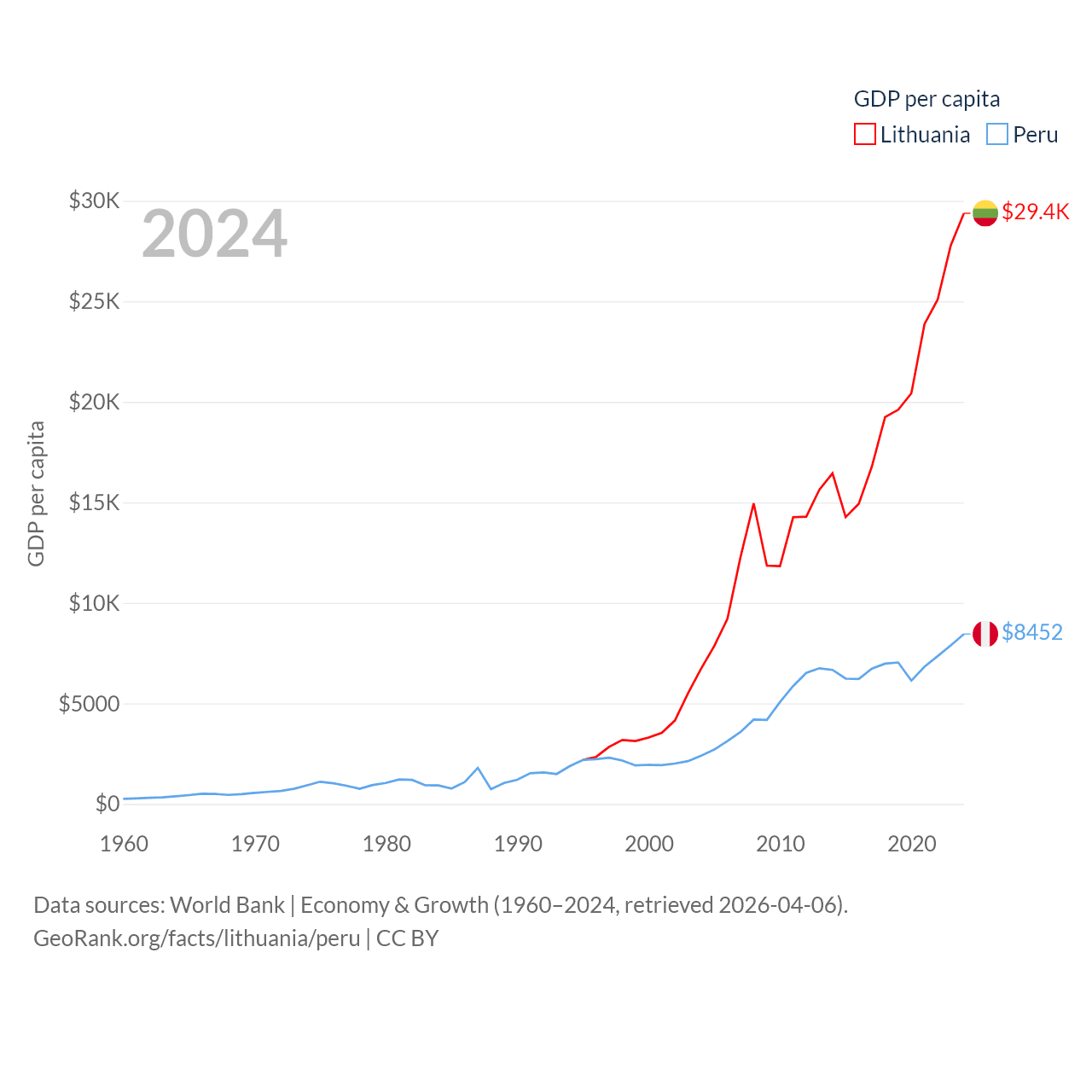 By GDP, Lithuania ranks 79/197 ($84.9B) and Peru ranks 49/197 ($289B). By GDP per capita, Lithuania ranks 43/197 ($29,384), while Peru ranks 91/197 ($8,452).