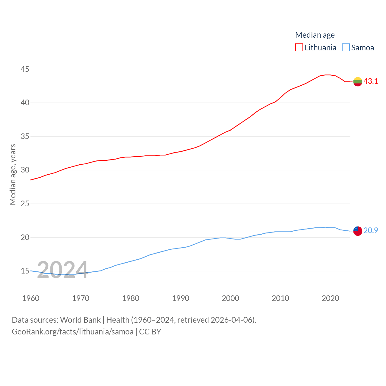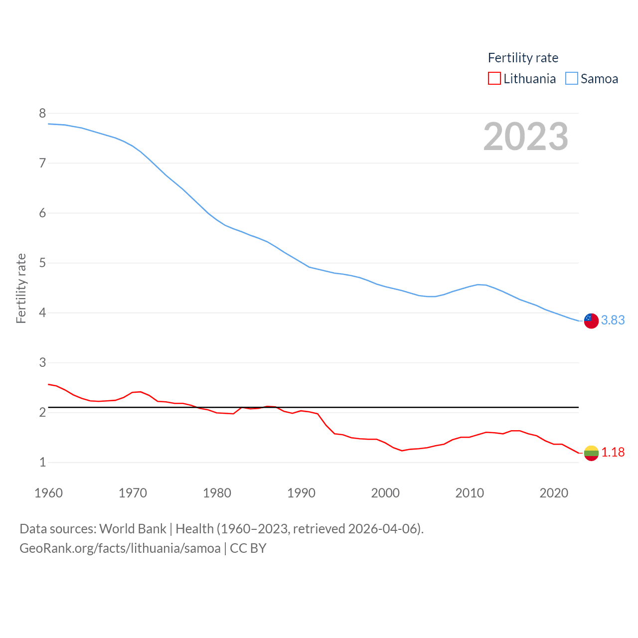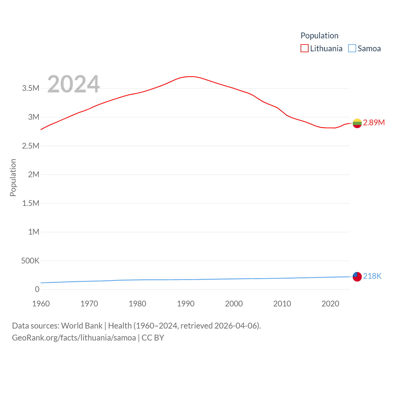 Lithuania has a population of 2.89M (ranked 137/197), compared with 218K in Samoa (ranked 177/197). Lithuania's land area is 24,170 sq mi versus 1,073 sq mi for Samoa (ranked 120th vs. 168th).