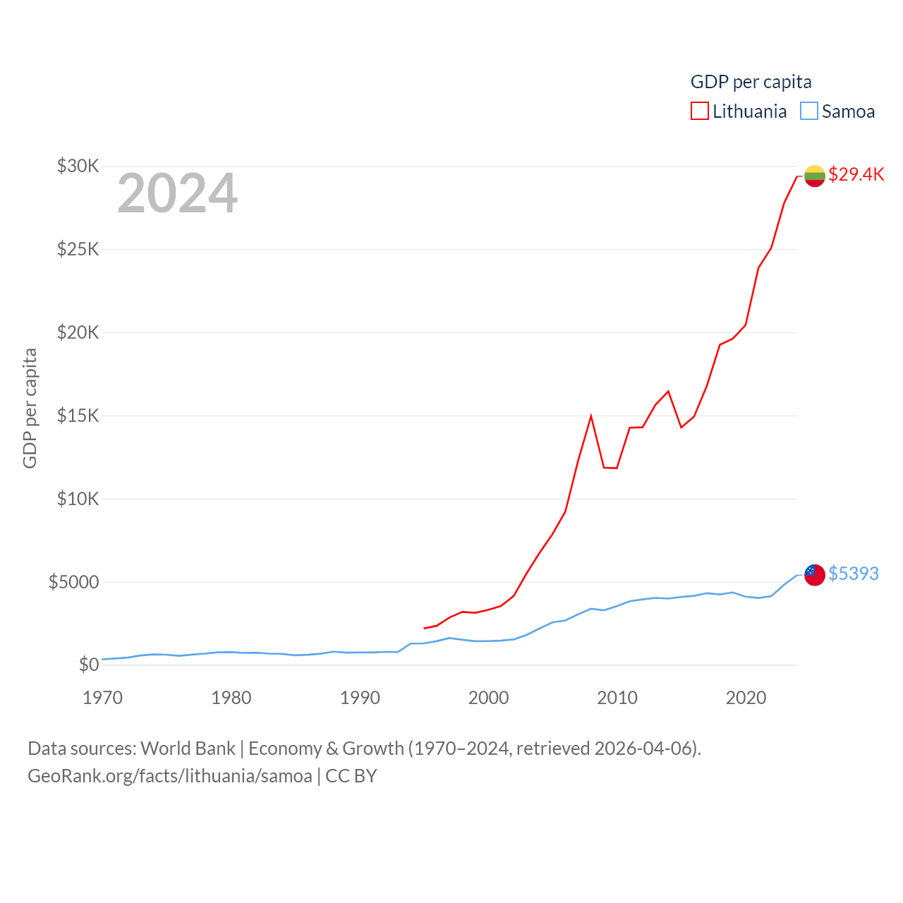 By GDP, Lithuania ranks 79/197 ($84.9B) and Samoa ranks 185/197 ($1.18B). By GDP per capita, Lithuania ranks 43/197 ($29,384), while Samoa ranks 117/197 ($5,393).