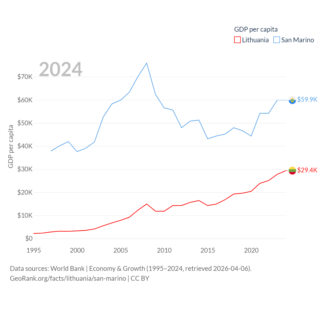 By GDP, Lithuania ranks 79/197 ($84.9B) and San Marino ranks 180/197 ($2.03B). By GDP per capita, Lithuania ranks 43/197 ($29,384), while San Marino ranks 15/197 ($59,880).