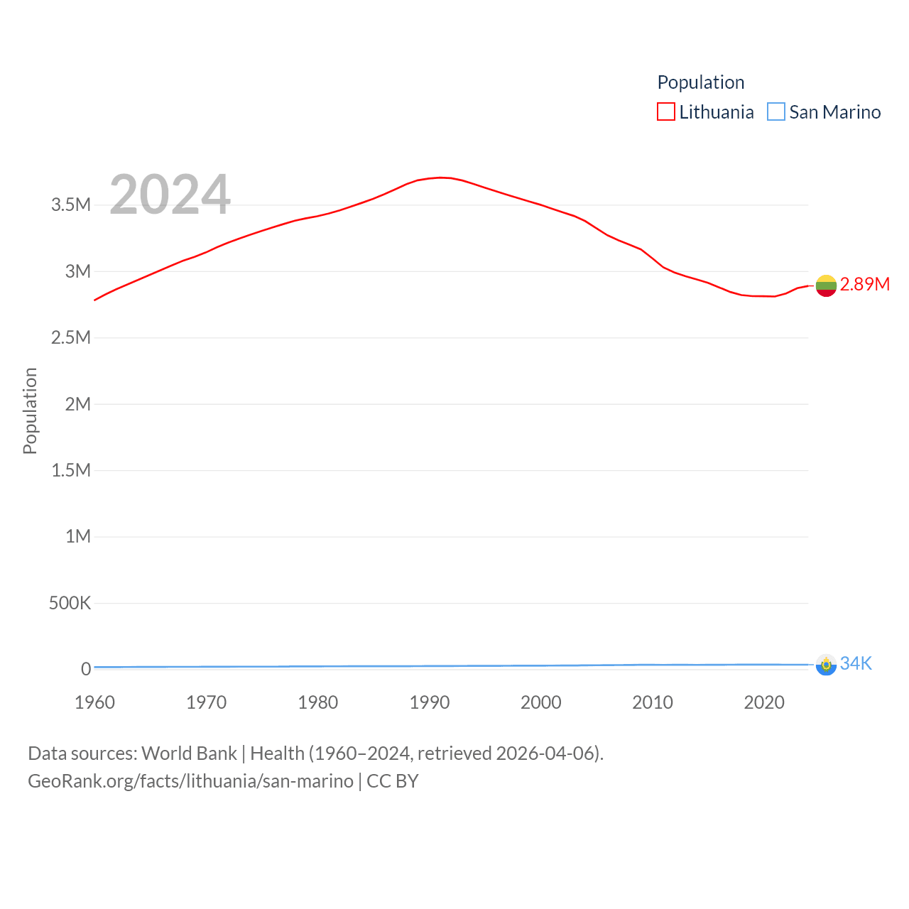 Lithuania has a population of 2.89M (ranked 137/197), compared with 34K in San Marino (ranked 193/197). Lithuania's land area is 24,170 sq mi versus 23.2 sq mi for San Marino (ranked 120th vs. 193rd).