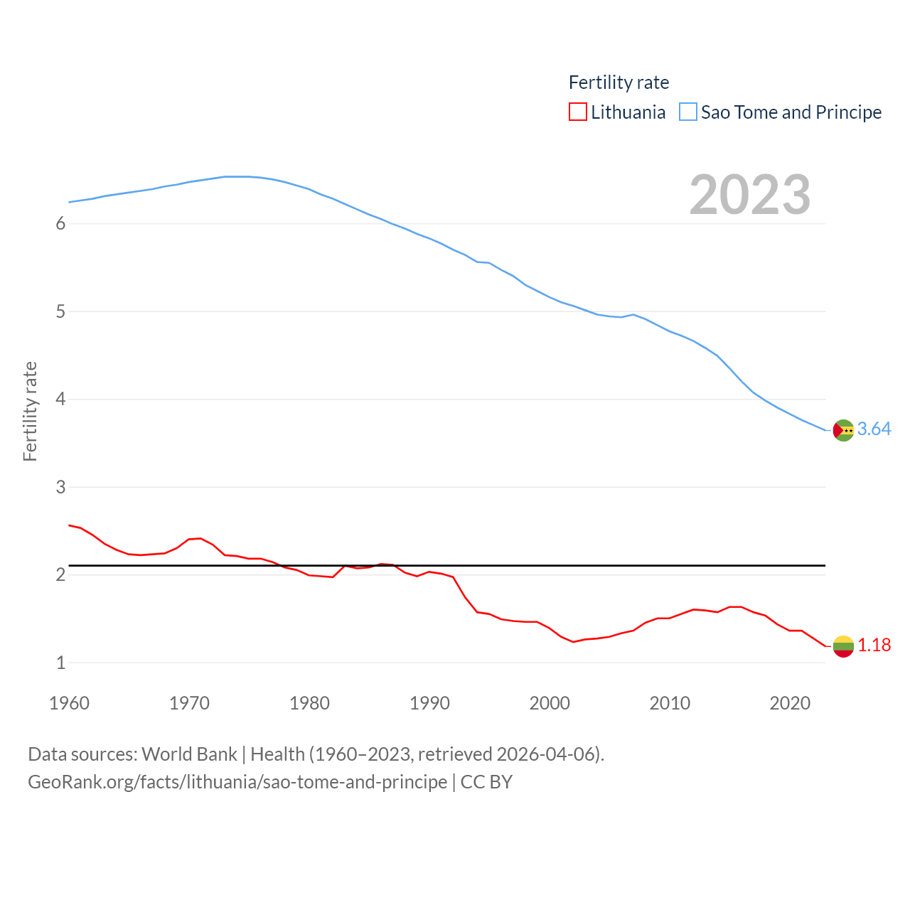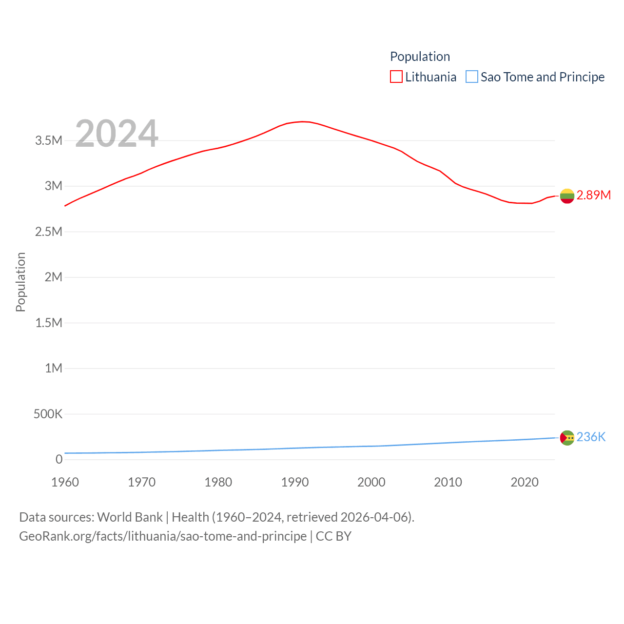 Lithuania has a population of 2.89M (ranked 137/197), compared with 236K in Sao Tome and Principe (ranked 176/197). Lithuania's land area is 24,170 sq mi versus 371 sq mi for Sao Tome and Principe (ranked 120th vs. 172nd).