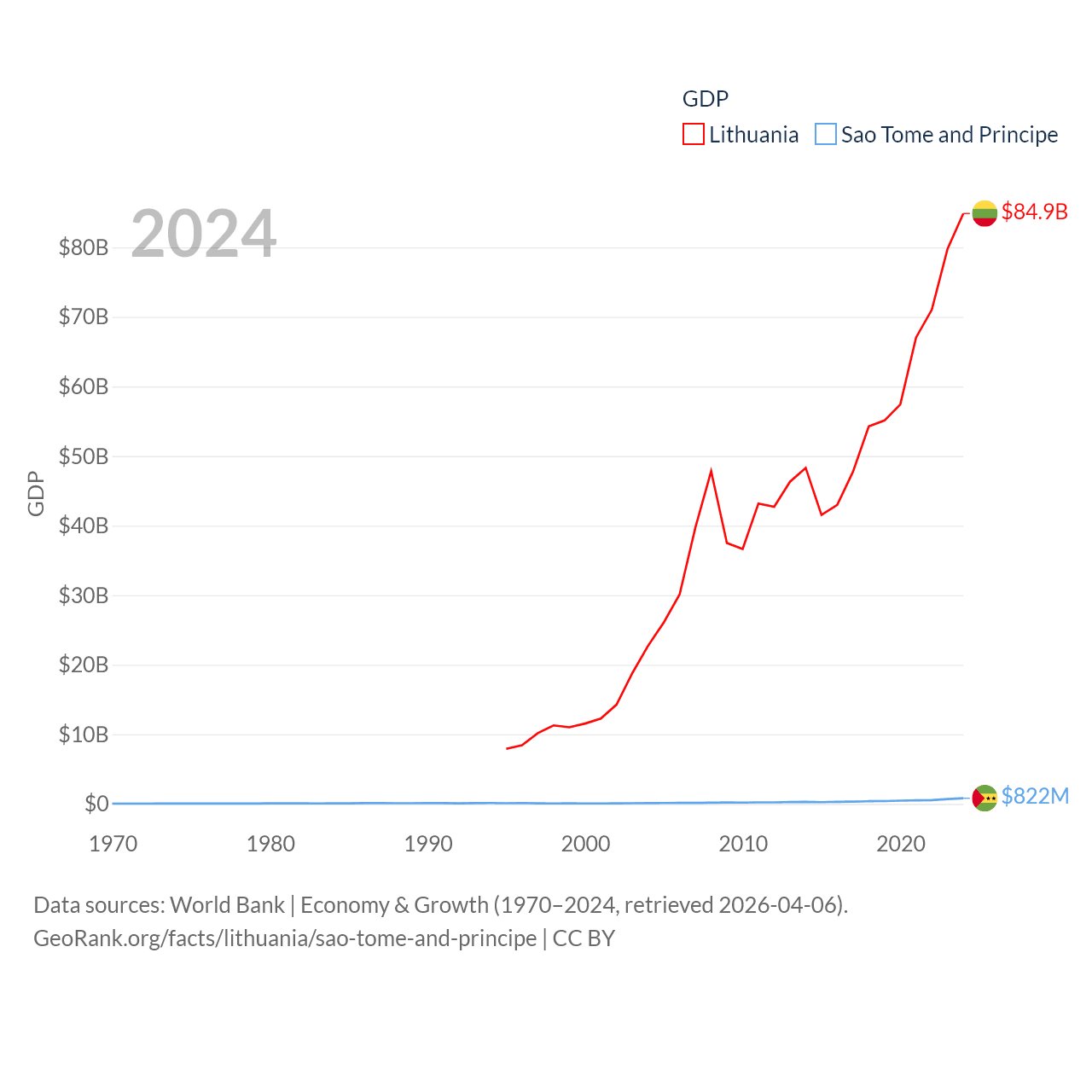 By GDP, Lithuania ranks 79/197 ($84.9B) and Sao Tome and Principe ranks 189/197 ($822M). By GDP per capita, Lithuania ranks 43/197 ($29,384), while Sao Tome and Principe ranks 134/197 ($3,491).