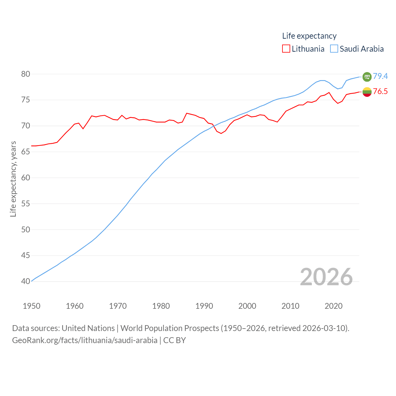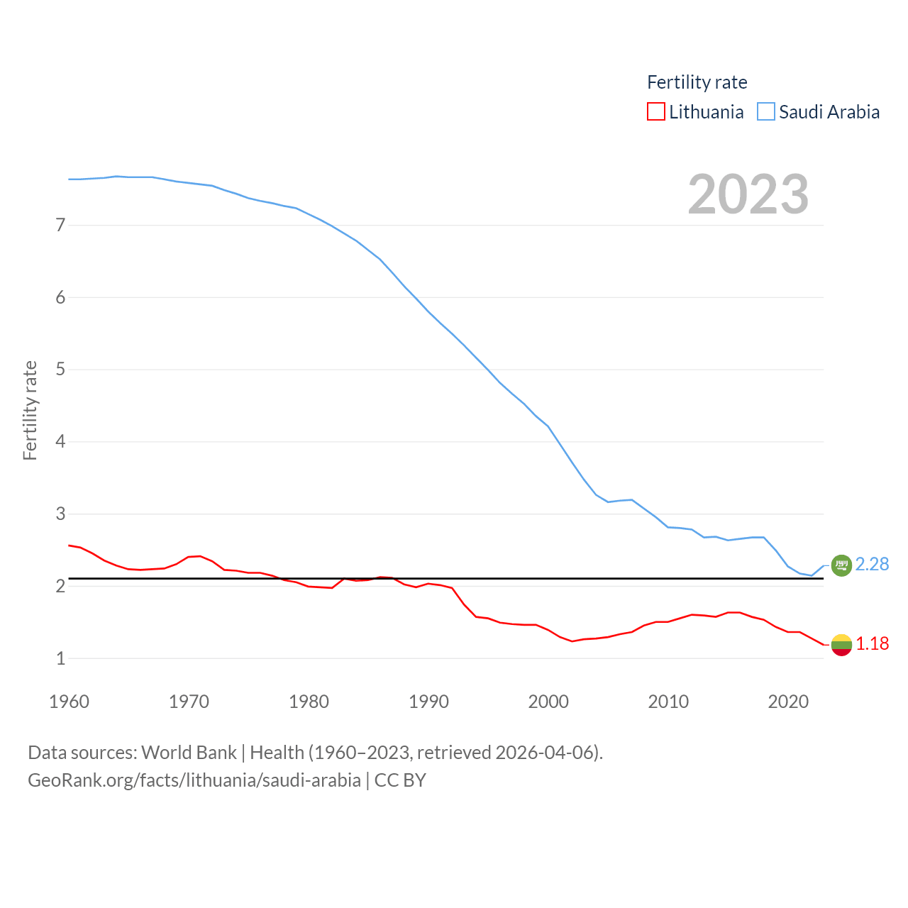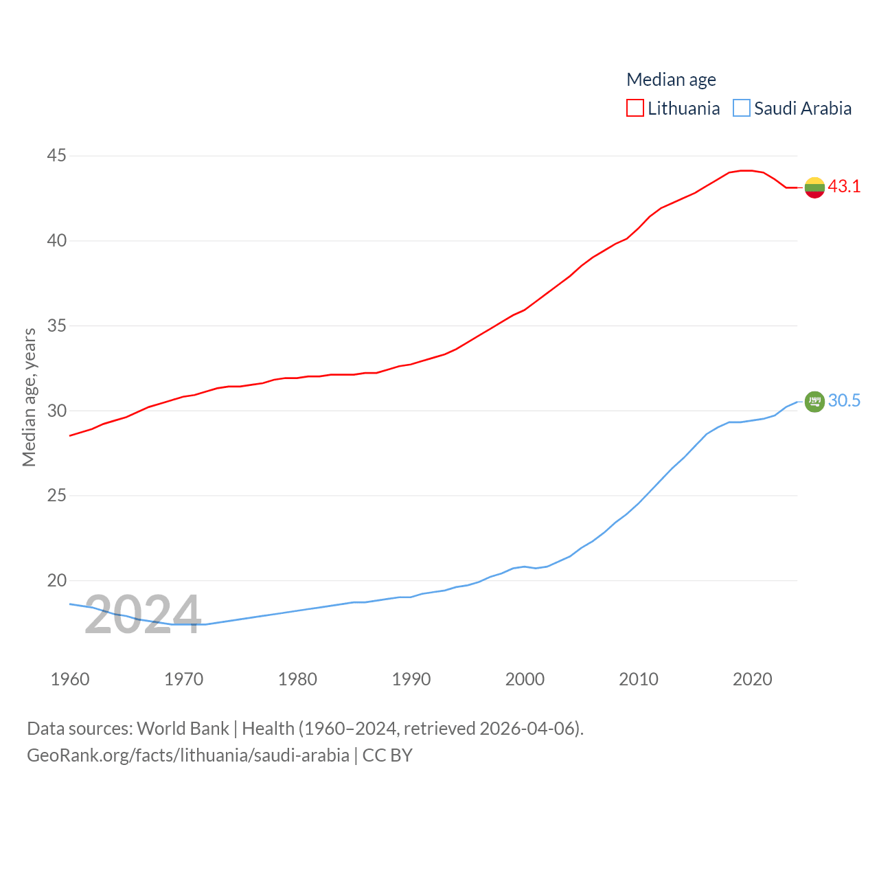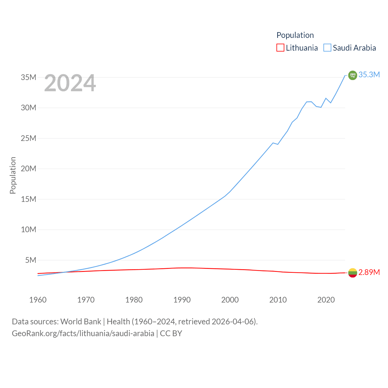 Lithuania has a population of 2.89M (ranked 137/197), compared with 35.3M in Saudi Arabia (ranked 45/197). Lithuania's land area is 24,170 sq mi versus 830,000 sq mi for Saudi Arabia (ranked 120th vs. 12th).