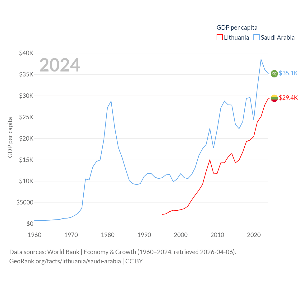 By GDP, Lithuania ranks 79/197 ($84.9B) and Saudi Arabia ranks 18/197 ($1.24T). By GDP per capita, Lithuania ranks 43/197 ($29,384), while Saudi Arabia ranks 33/197 ($35,122).