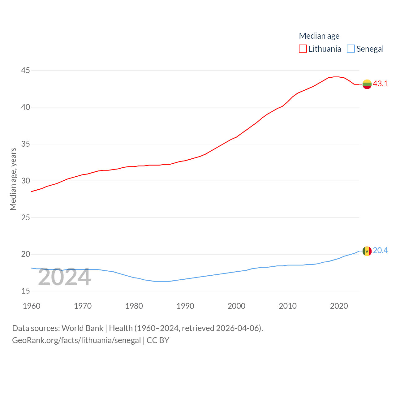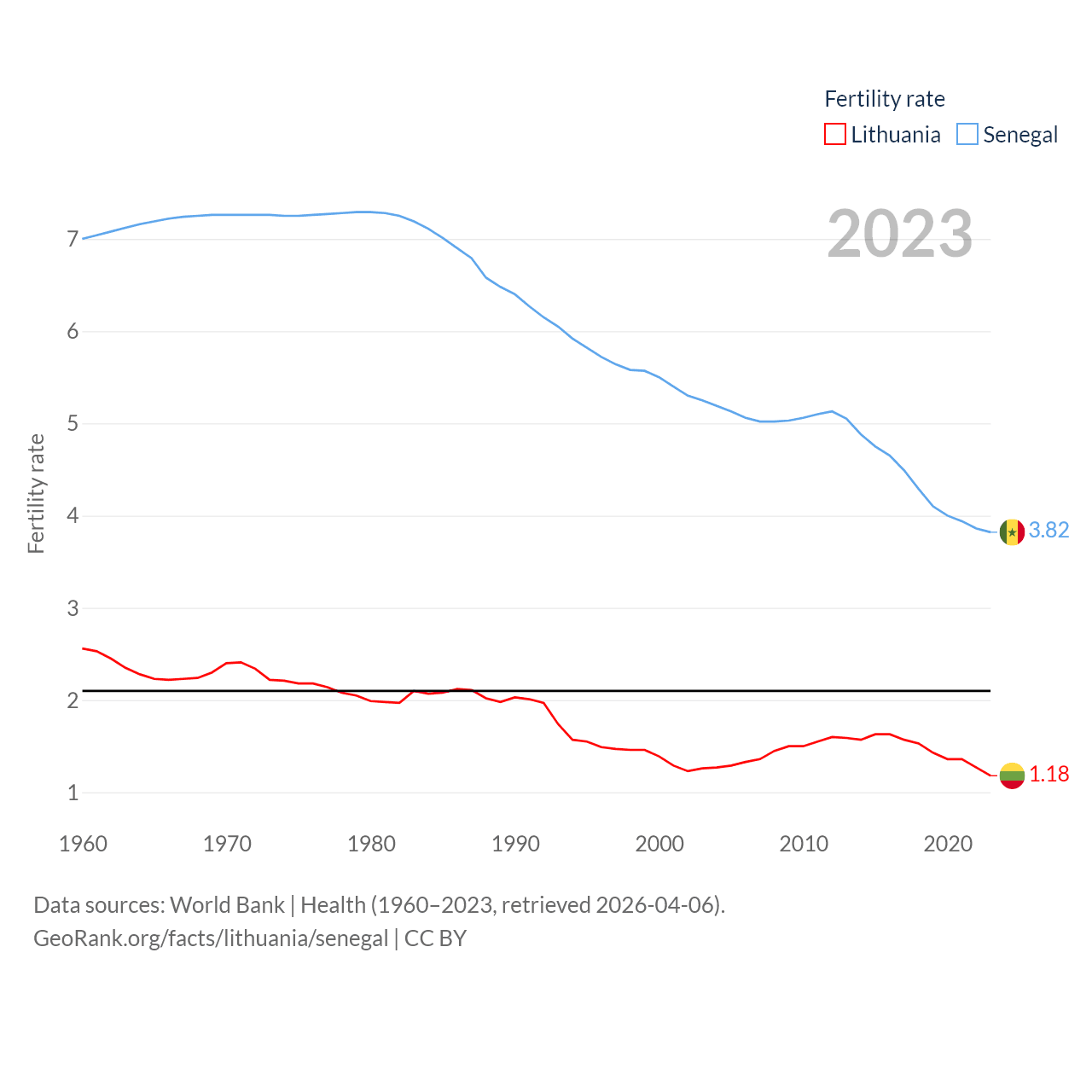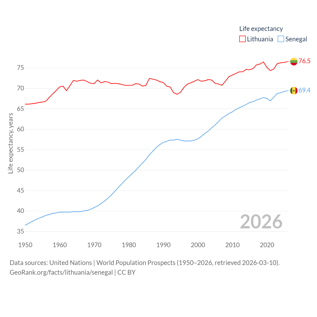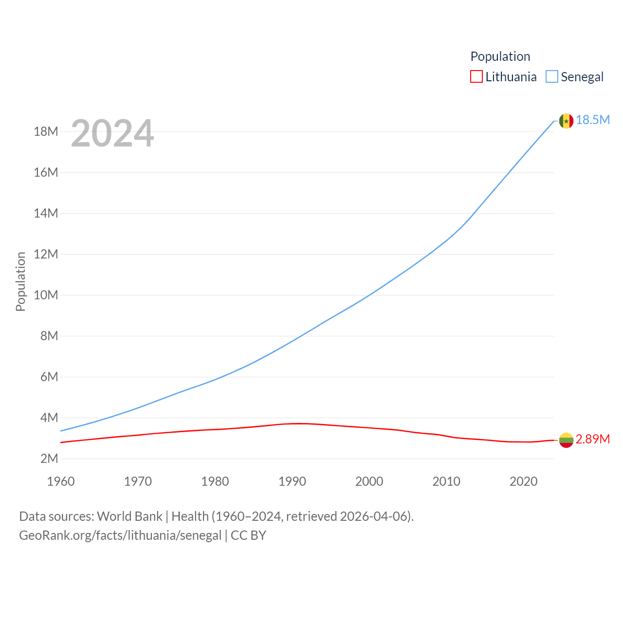 Lithuania has a population of 2.89M (ranked 137/197), compared with 18.5M in Senegal (ranked 69/197). Lithuania's land area is 24,170 sq mi versus 74,336 sq mi for Senegal (ranked 120th vs. 85th).