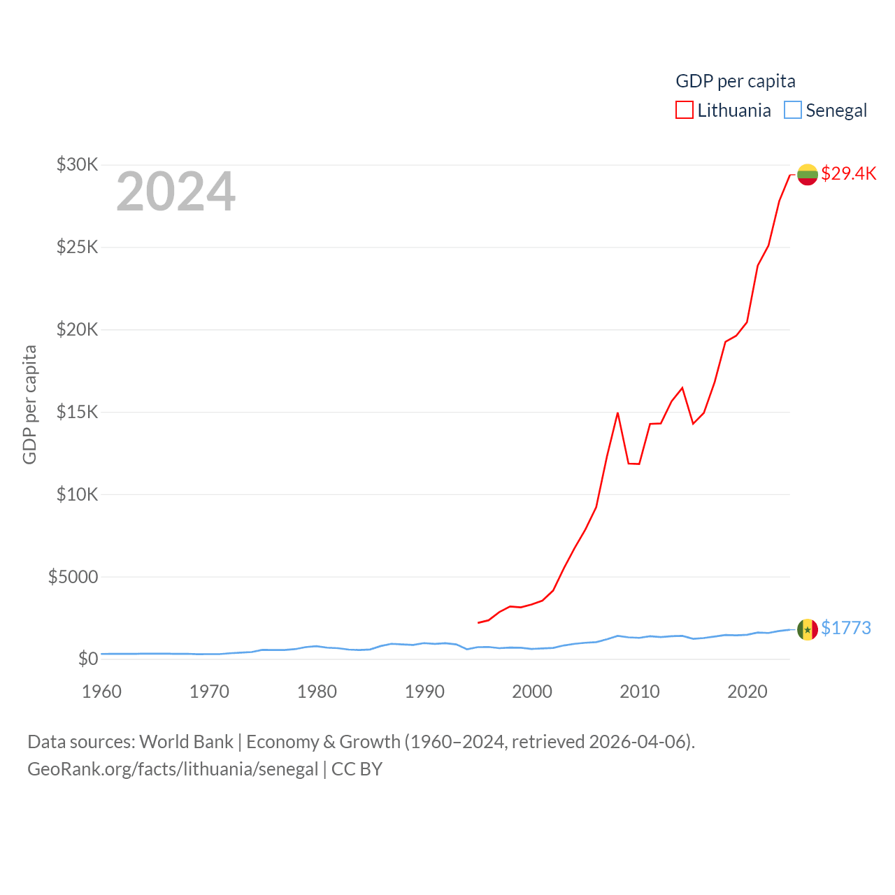 By GDP, Lithuania ranks 79/197 ($84.9B) and Senegal ranks 109/197 ($32.8B). By GDP per capita, Lithuania ranks 43/197 ($29,384), while Senegal ranks 159/197 ($1,773).
