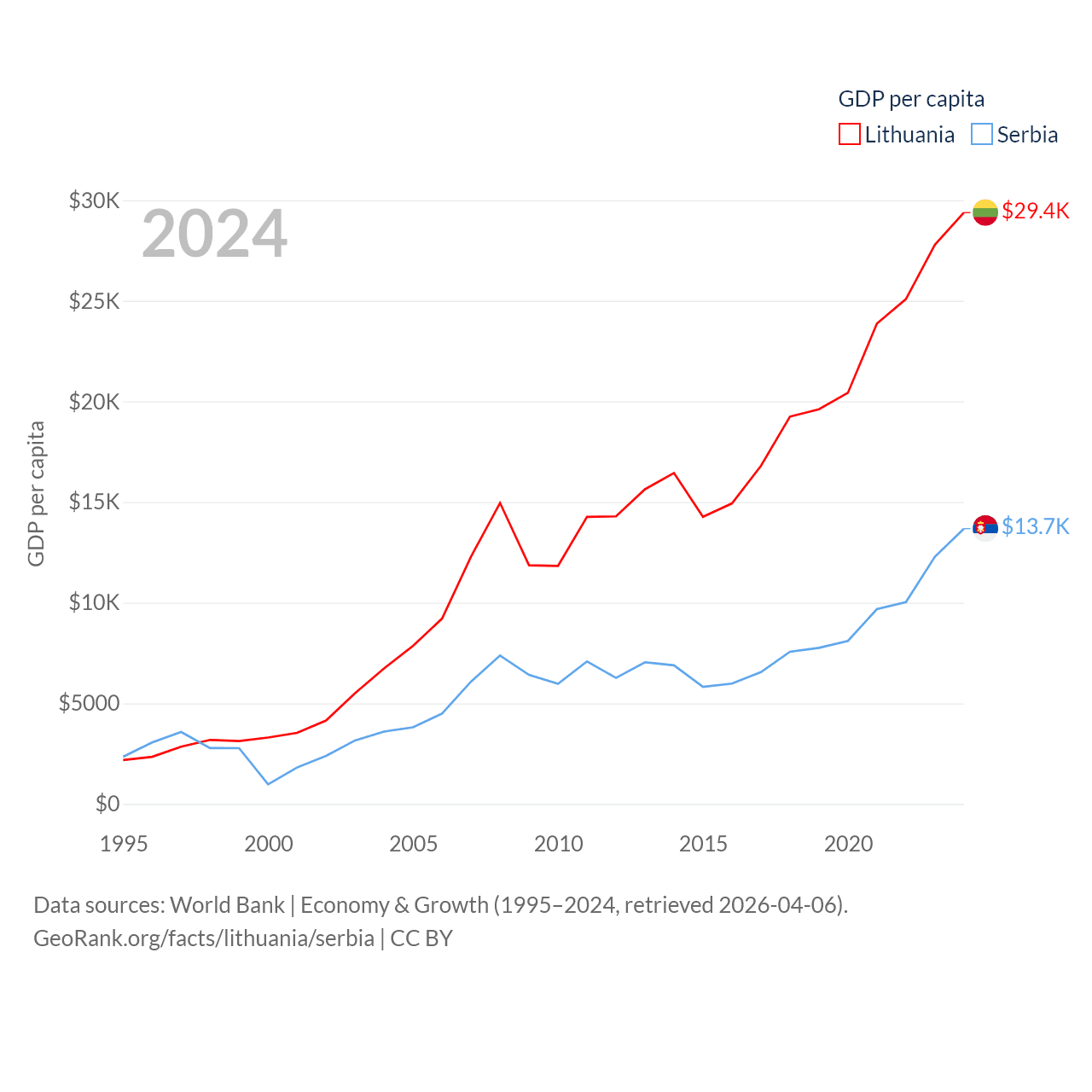 By GDP, Lithuania ranks 79/197 ($84.9B) and Serbia ranks 76/197 ($90.1B). By GDP per capita, Lithuania ranks 43/197 ($29,384), while Serbia ranks 73/197 ($13,679).