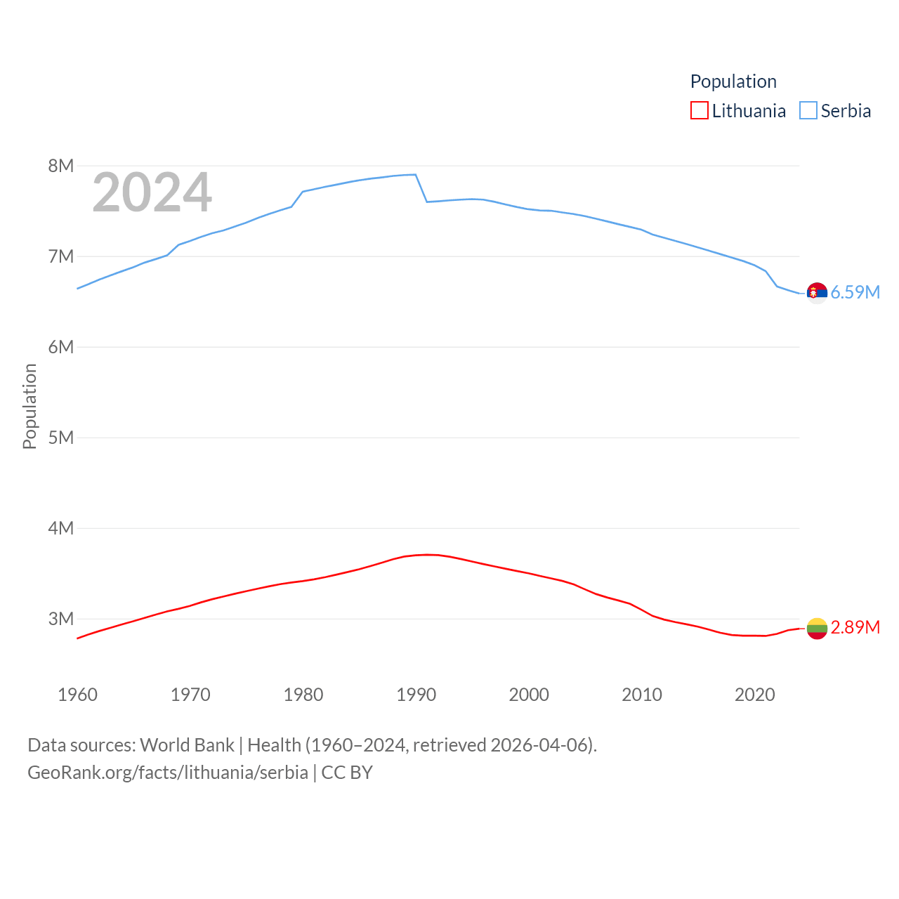 Lithuania has a population of 2.89M (ranked 137/197), compared with 6.59M in Serbia (ranked 109/197). Lithuania's land area is 24,170 sq mi versus 32,467 sq mi for Serbia (ranked 120th vs. 111th).