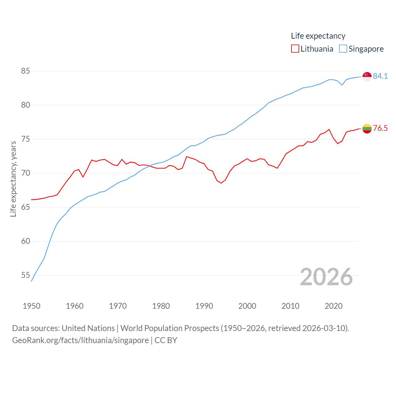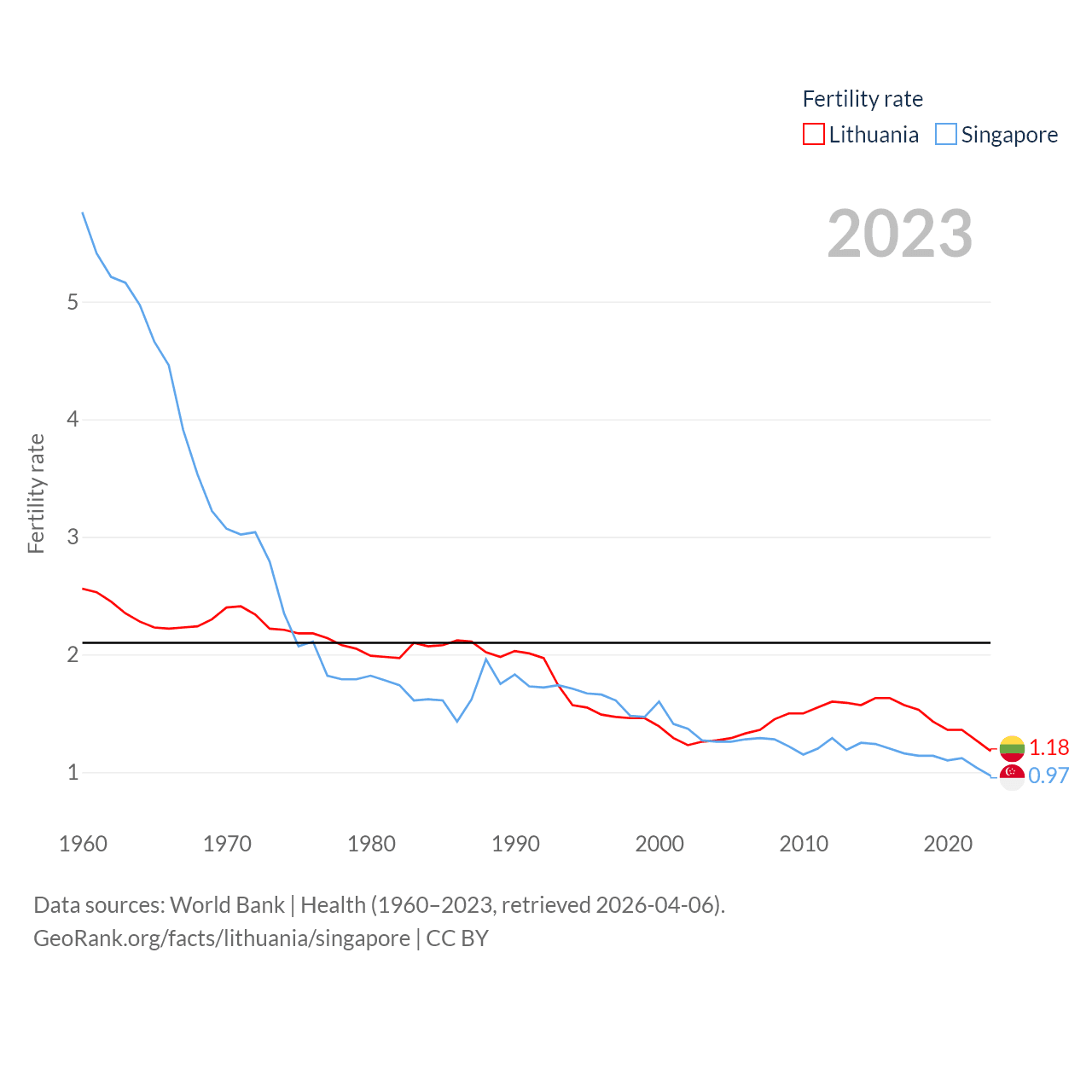 Lithuania has a population of 2.89M (ranked 137/197), compared with 6.04M in Singapore (ranked 113/197). Lithuania's land area is 24,170 sq mi versus 277.2 sq mi for Singapore (ranked 120th vs. 177th).
