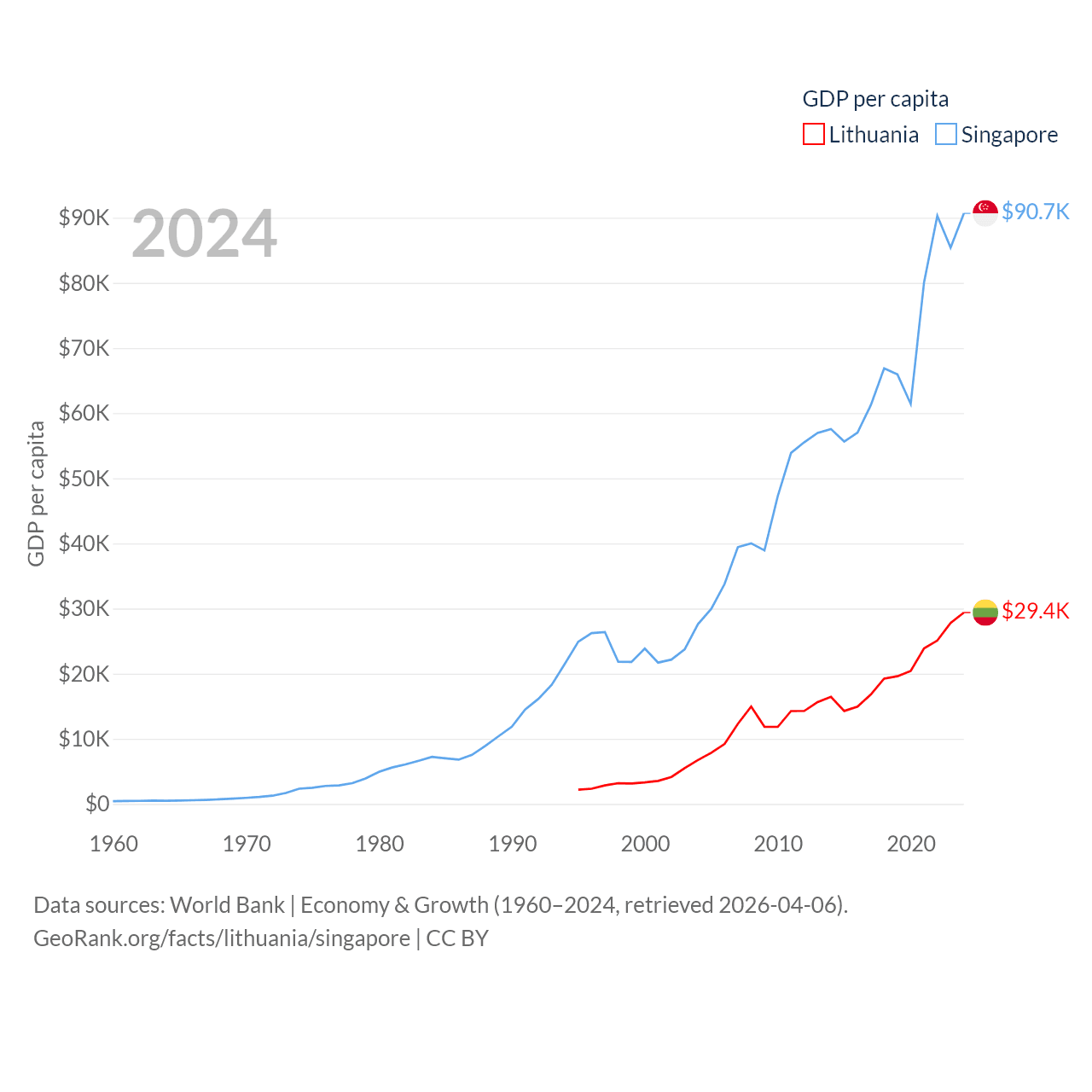 By GDP, Lithuania ranks 79/197 ($84.9B) and Singapore ranks 28/197 ($547B). By GDP per capita, Lithuania ranks 43/197 ($29,384), while Singapore ranks 7/197 ($90,674).