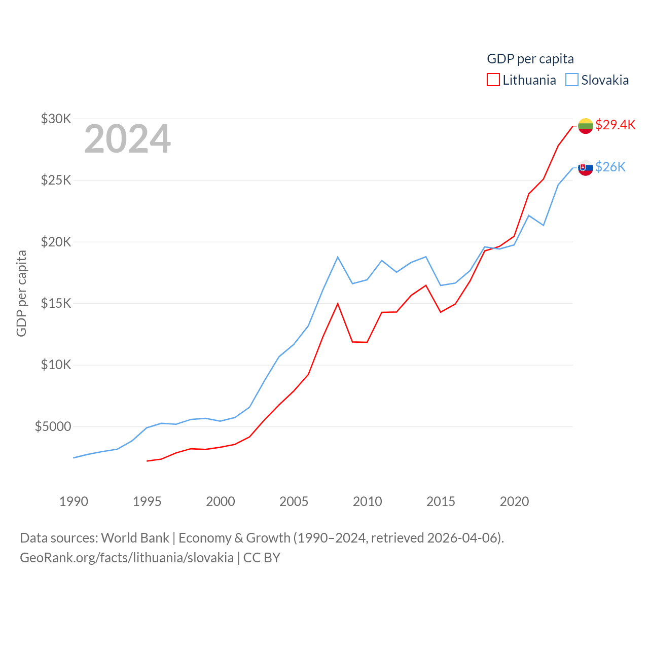 By GDP, Lithuania ranks 79/197 ($84.9B) and Slovakia ranks 61/197 ($141B). By GDP per capita, Lithuania ranks 43/197 ($29,384), while Slovakia ranks 47/197 ($25,993).