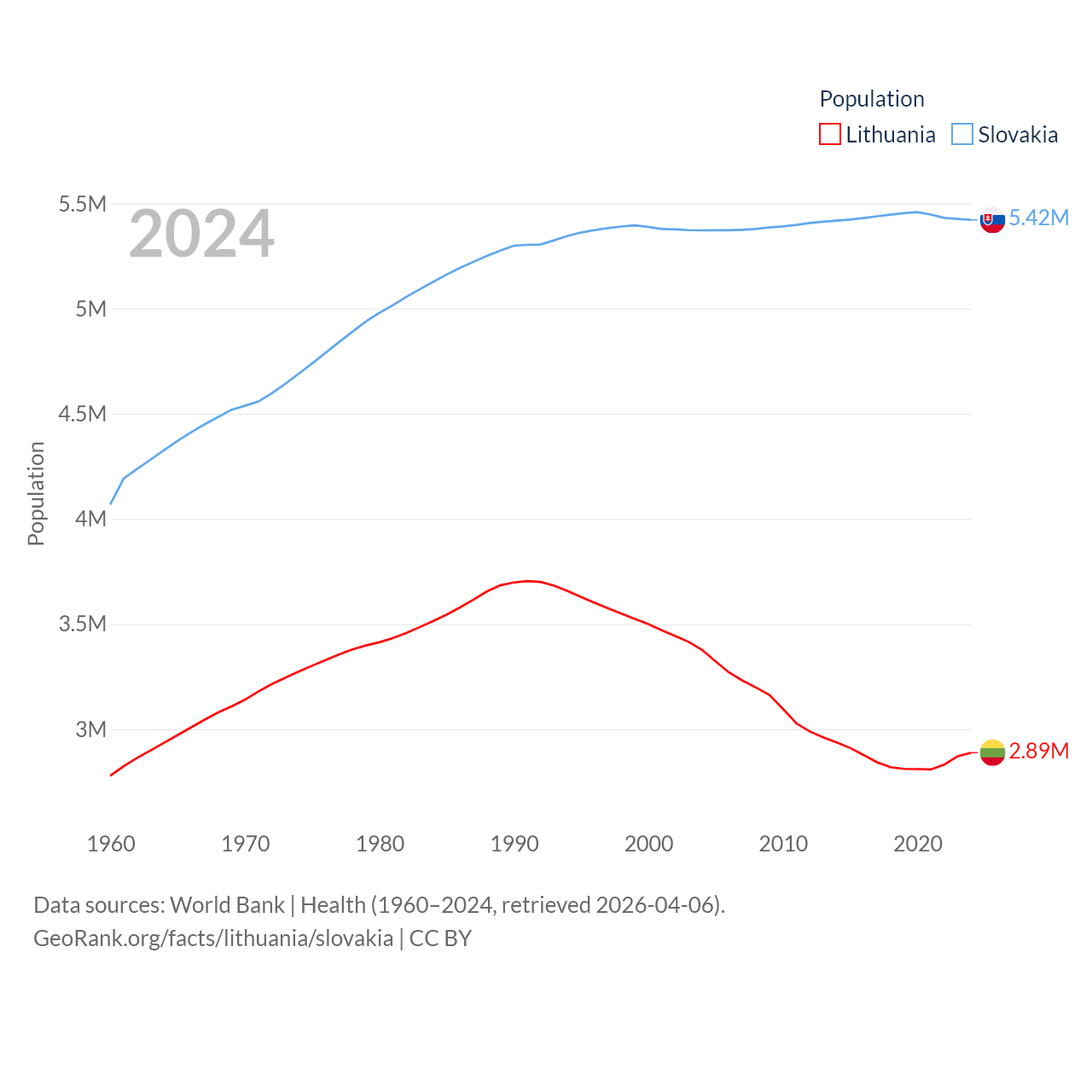 Lithuania has a population of 2.89M (ranked 137/197), compared with 5.42M in Slovakia (ranked 119/197). Lithuania's land area is 24,170 sq mi versus 18,564 sq mi for Slovakia (ranked 120th vs. 128th).